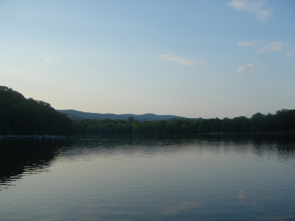Description: A lake with a mountain in the background and trees in the foreground and a blue sky with clouds.