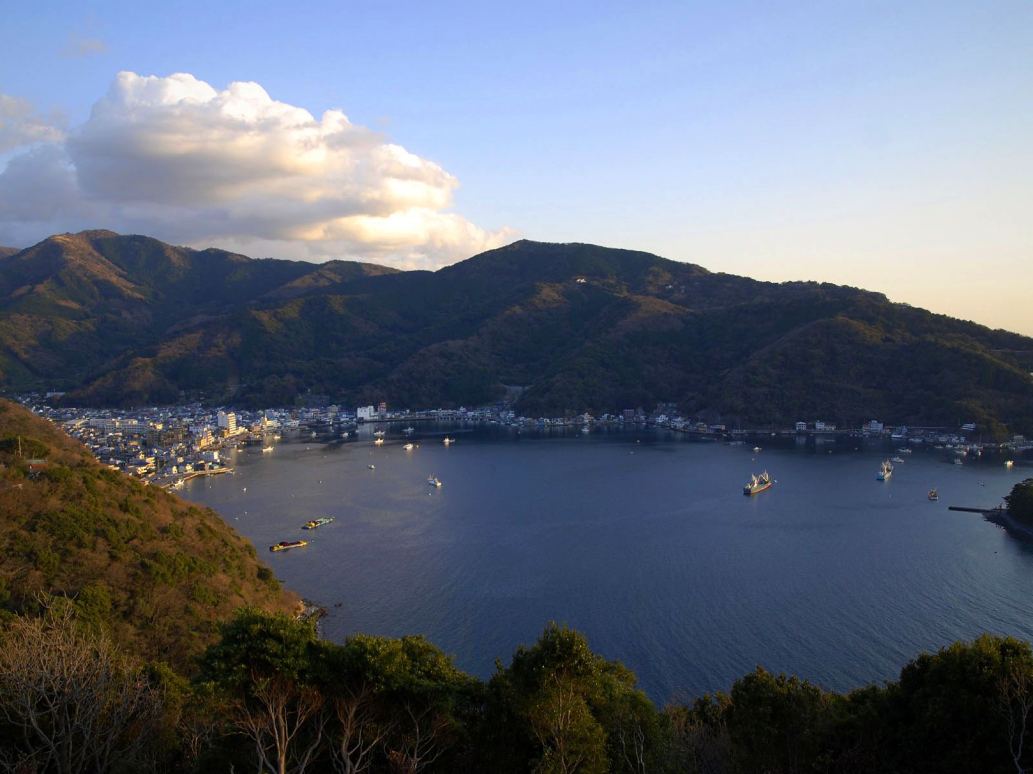 Description: A lake surrounded by mountains and a city on the other side of it with a sky background and clouds.