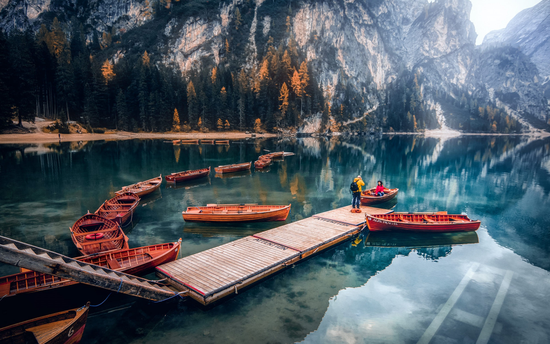 Description: A man standing on a dock next to a lake with boats in it and mountains in the background with a lake and mountains.