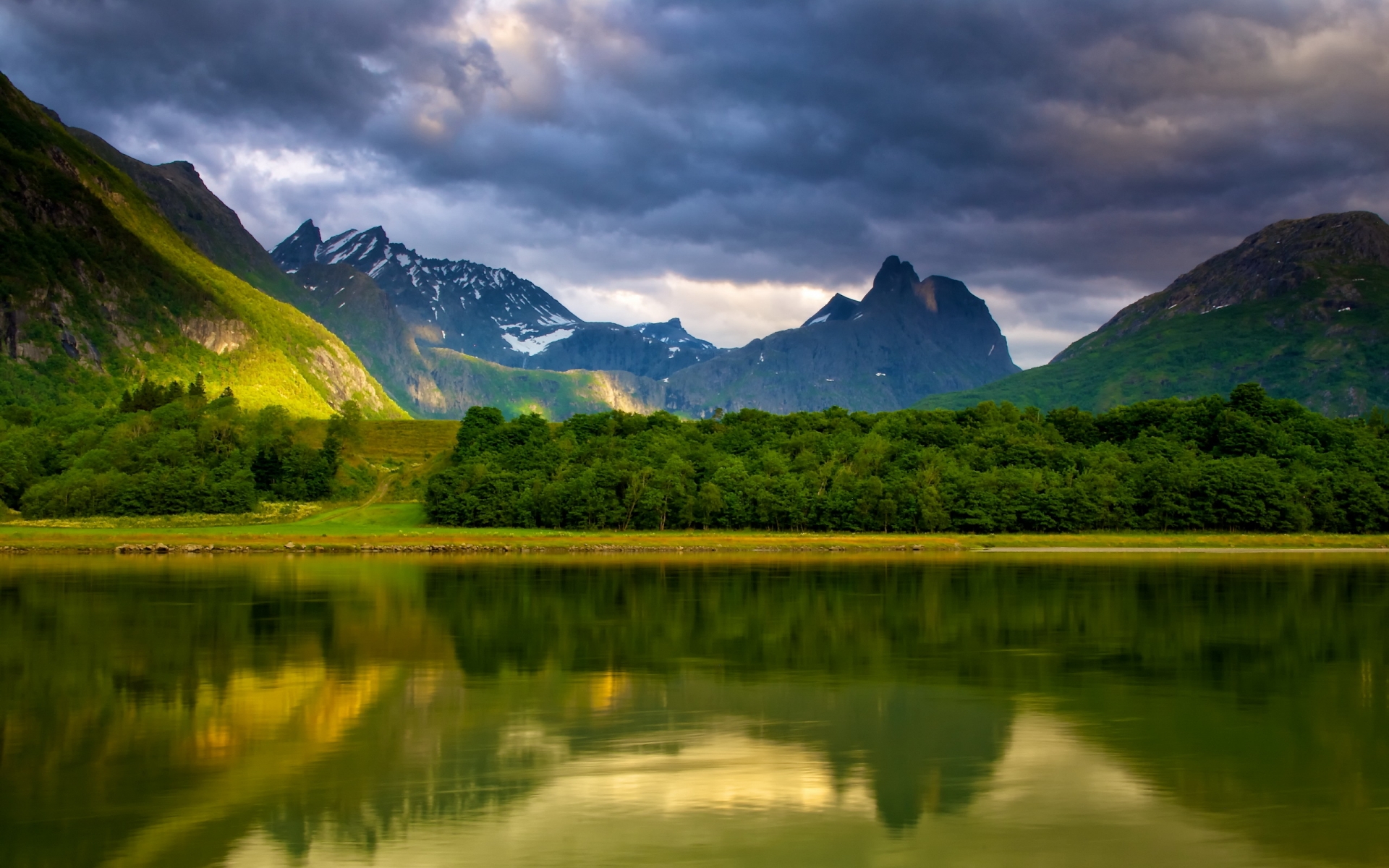 Description: A lake surrounded by mountains under a cloudy sky with a green forest and a grassy area in the foreground.