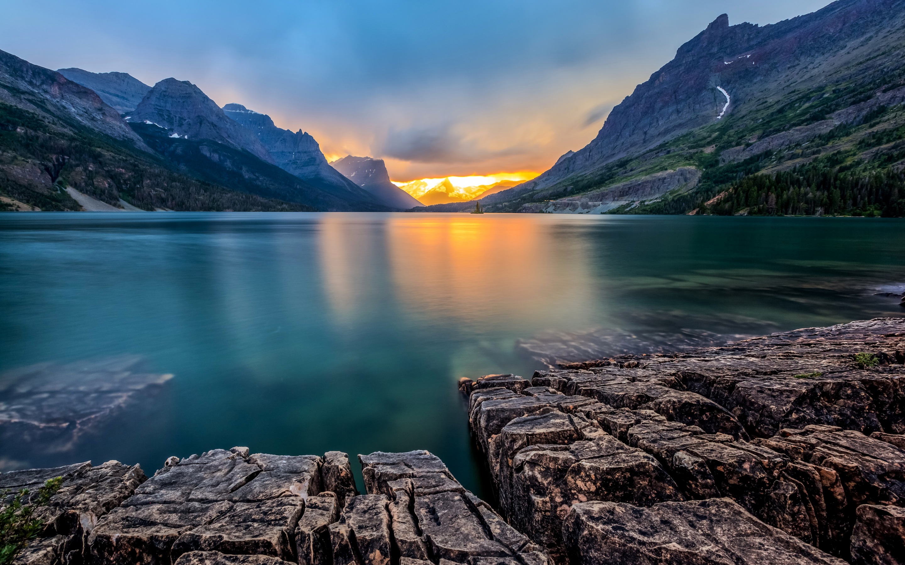 Description: A lake surrounded by mountains and a forest at sunset with a cloudy sky above it and a few rocks in the foreground.