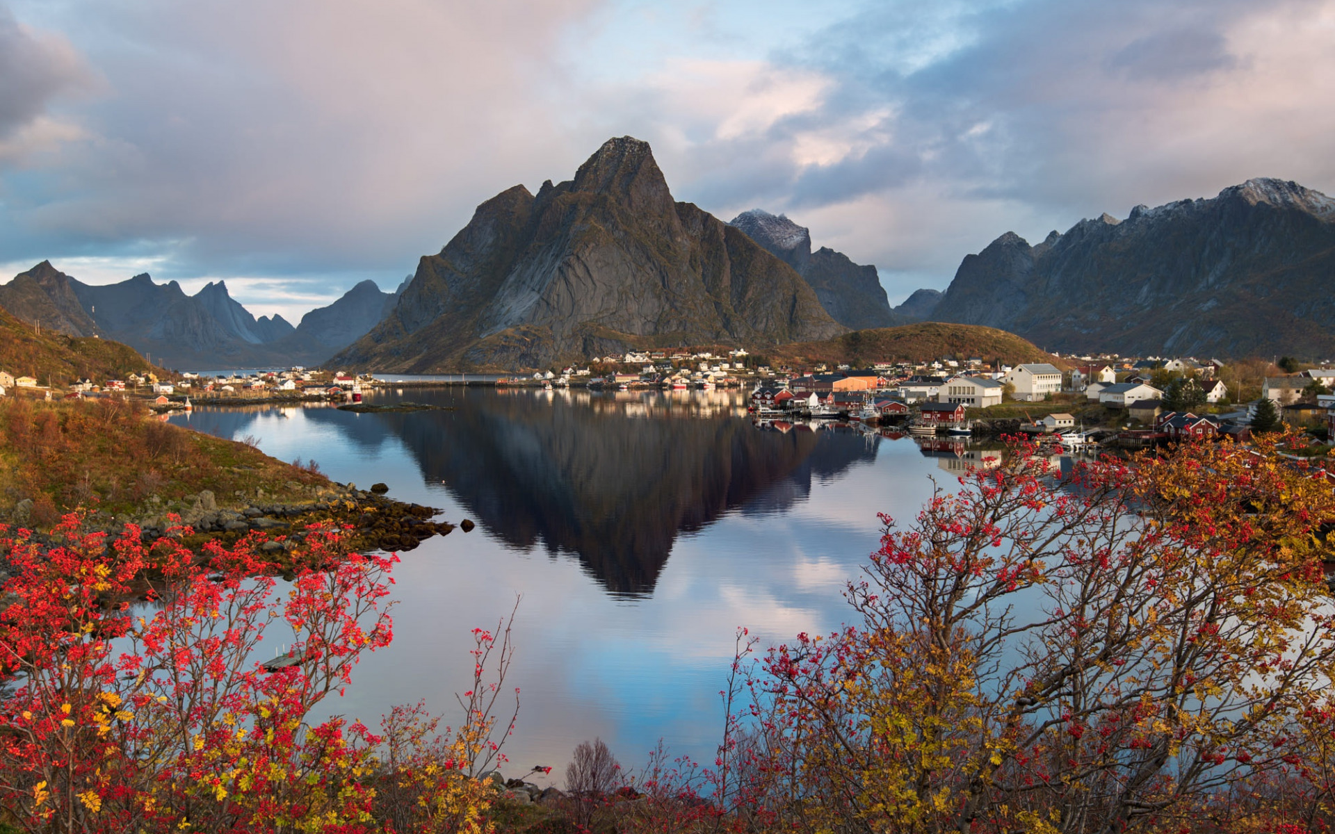 Description: A lake surrounded by mountains and houses with red leaves on the trees and bushes in front of it and a cloudy sky.