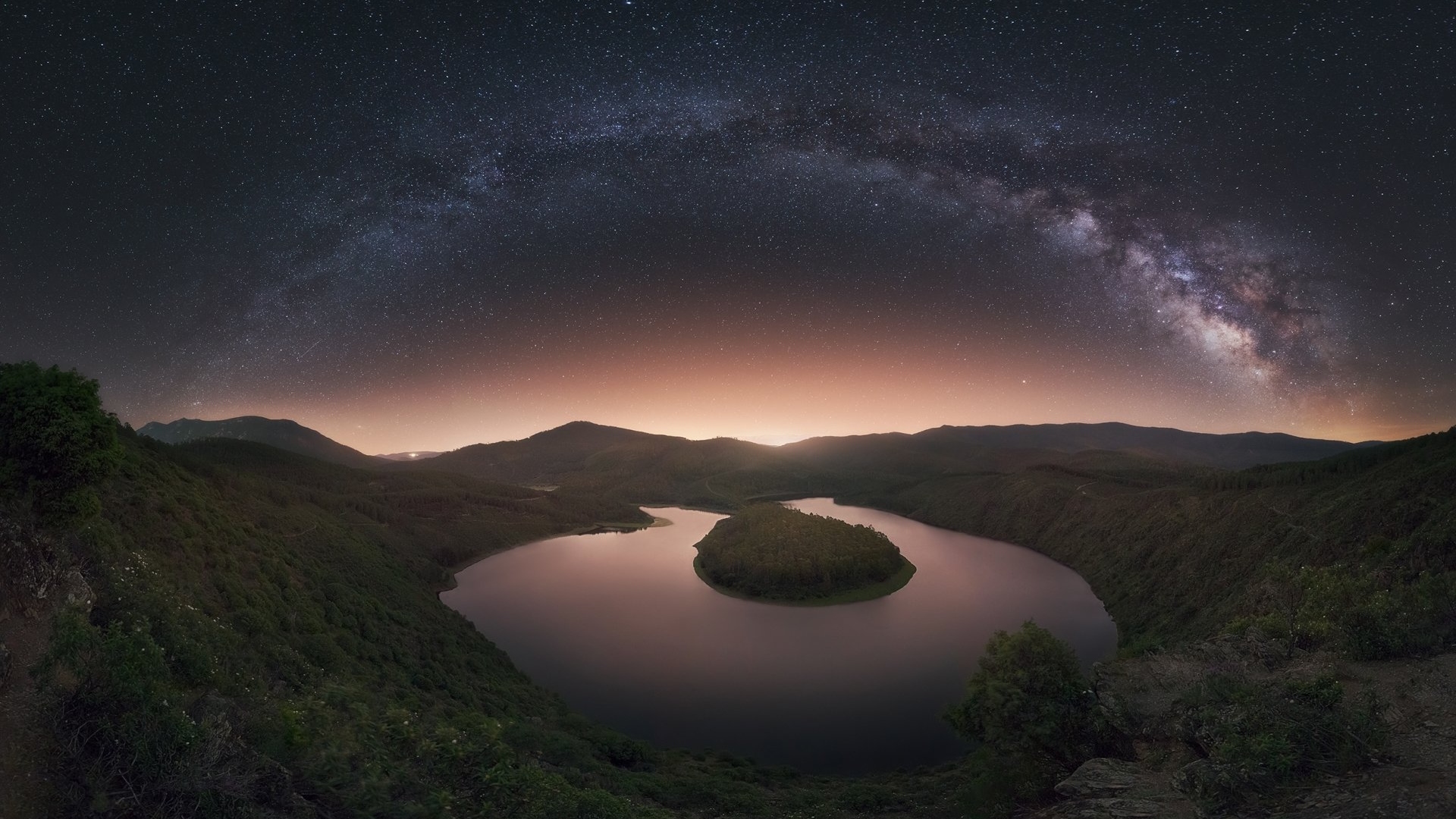 Description: A lake surrounded by mountains under a night sky with stars above it and a star filled sky above it.