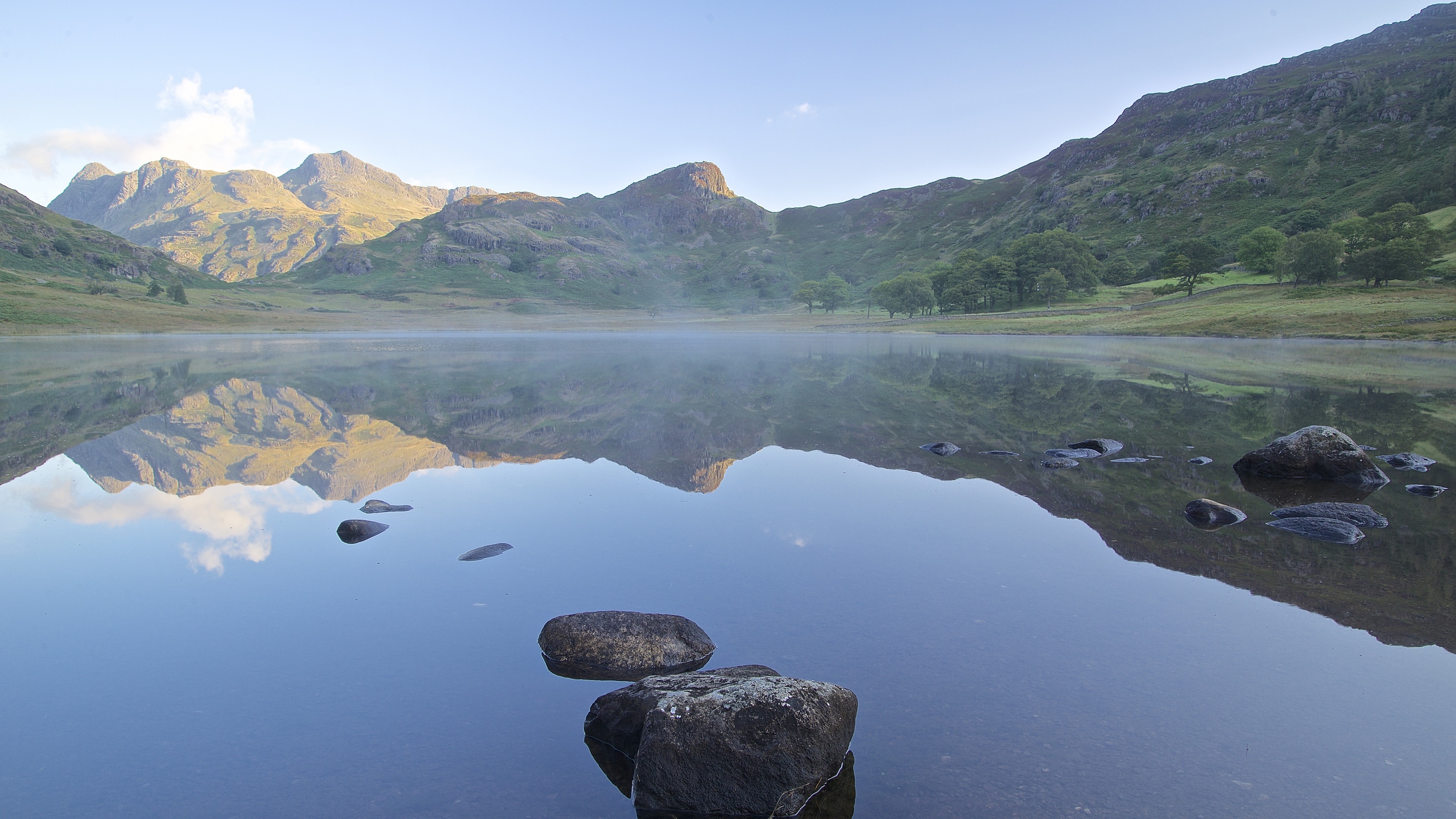 Description: A lake surrounded by mountains with rocks in the water and a few rocks in the water with a few rocks in the water.