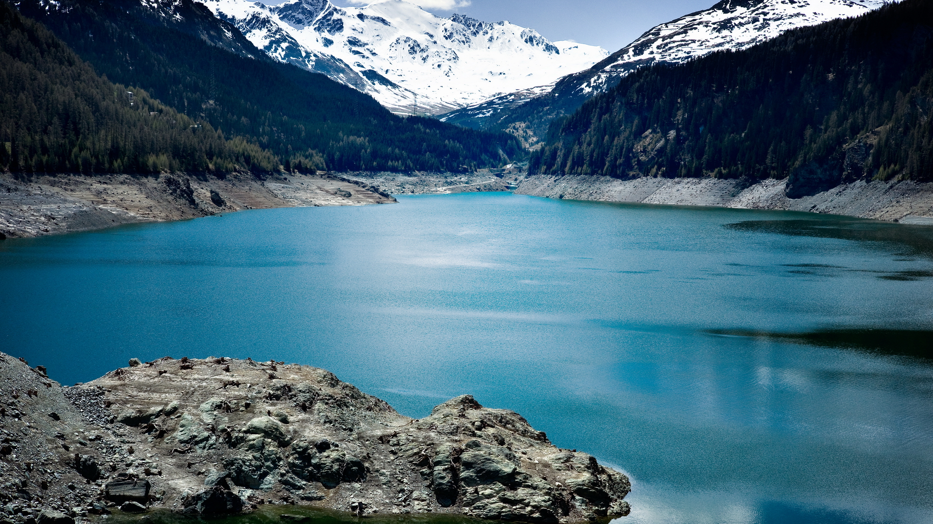 Description: A large body of water surrounded by mountains and trees in the background with a snow covered mountain in the distance.