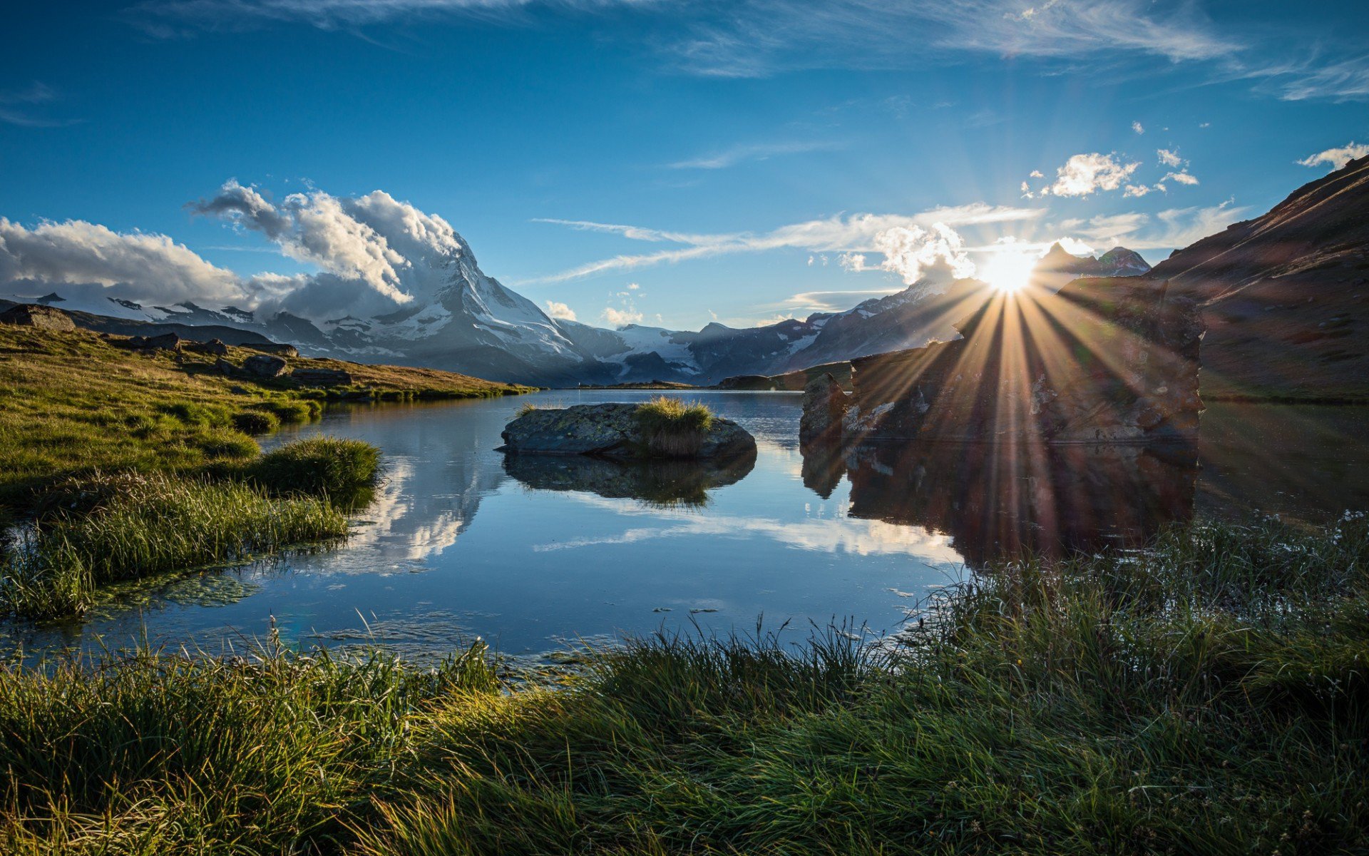 Description: A lake surrounded by mountains and grass with the sun shining through the clouds above it and a mountain range in the distance.