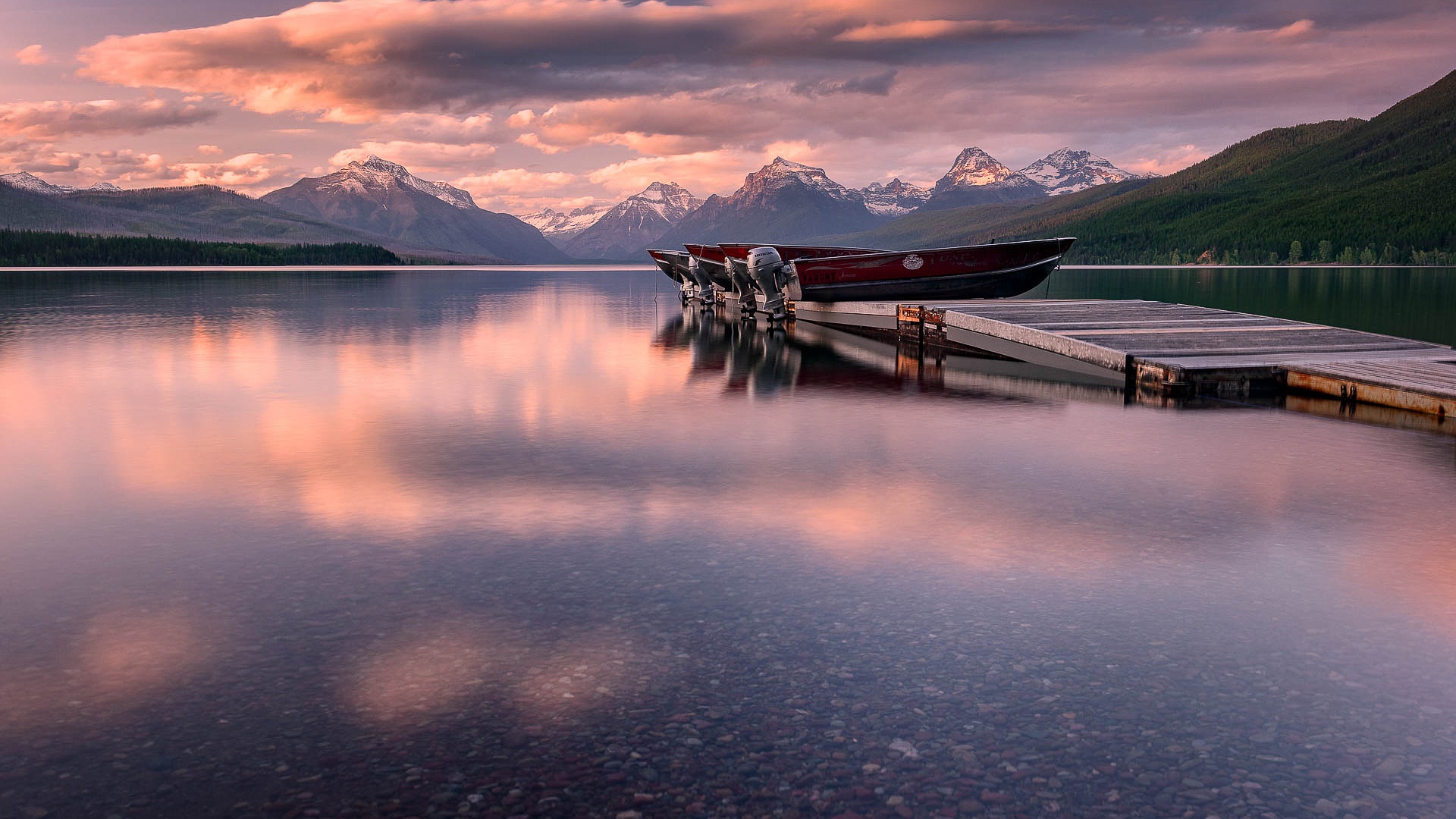 Description: A boat is docked at a pier on a lake with mountains in the background at sunset or dawn with clouds in the sky.