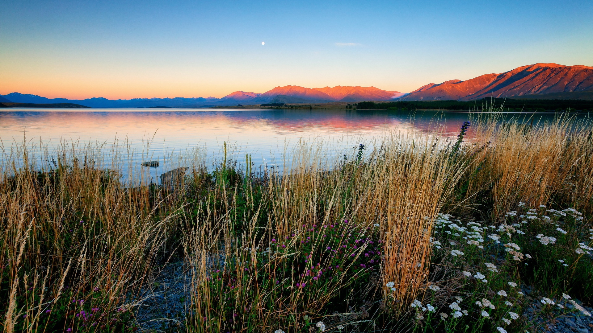 Description: A lake with a mountain range in the background at sunset with a few flowers in the foreground and a few grass in the foreground.