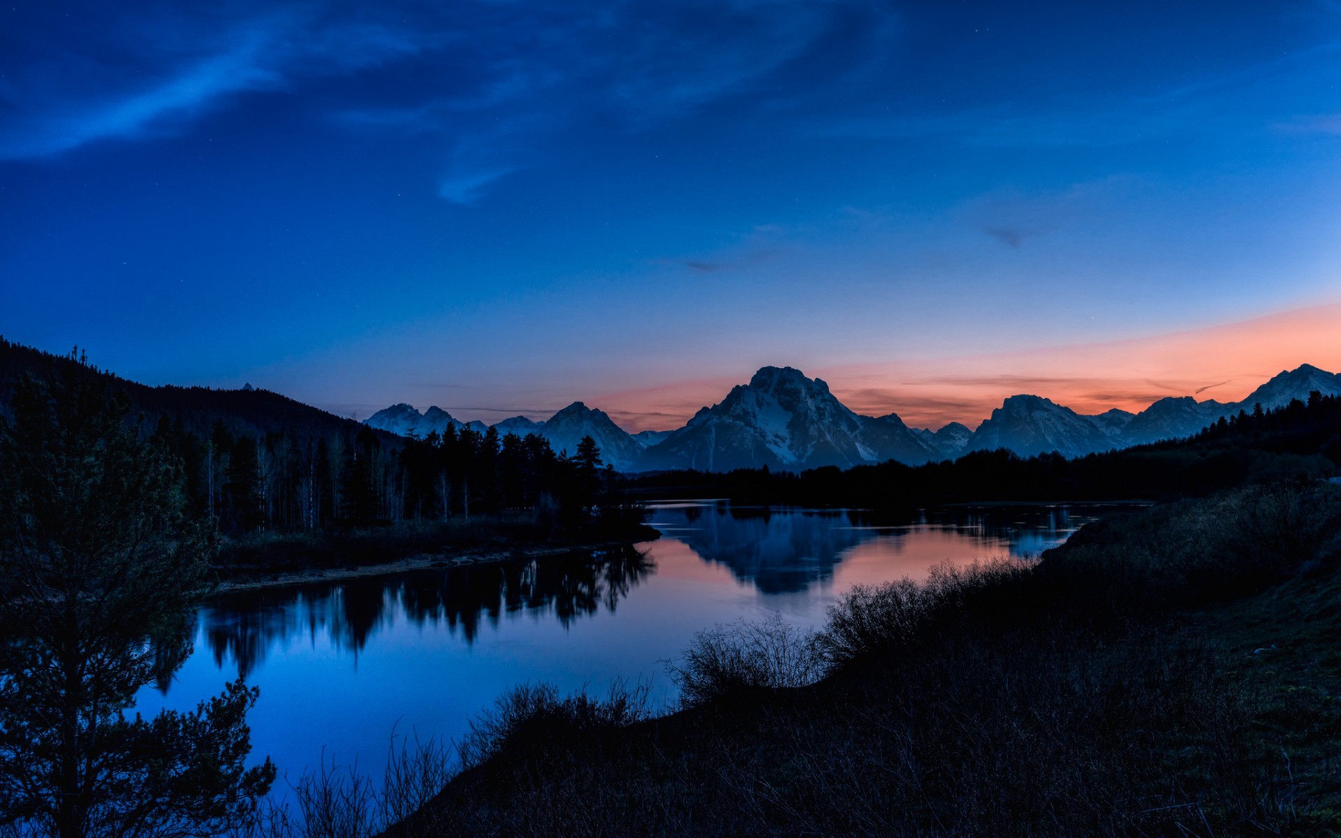 Description: A lake with mountains in the background at sunset or dawn with a pink sky and clouds in the distance.