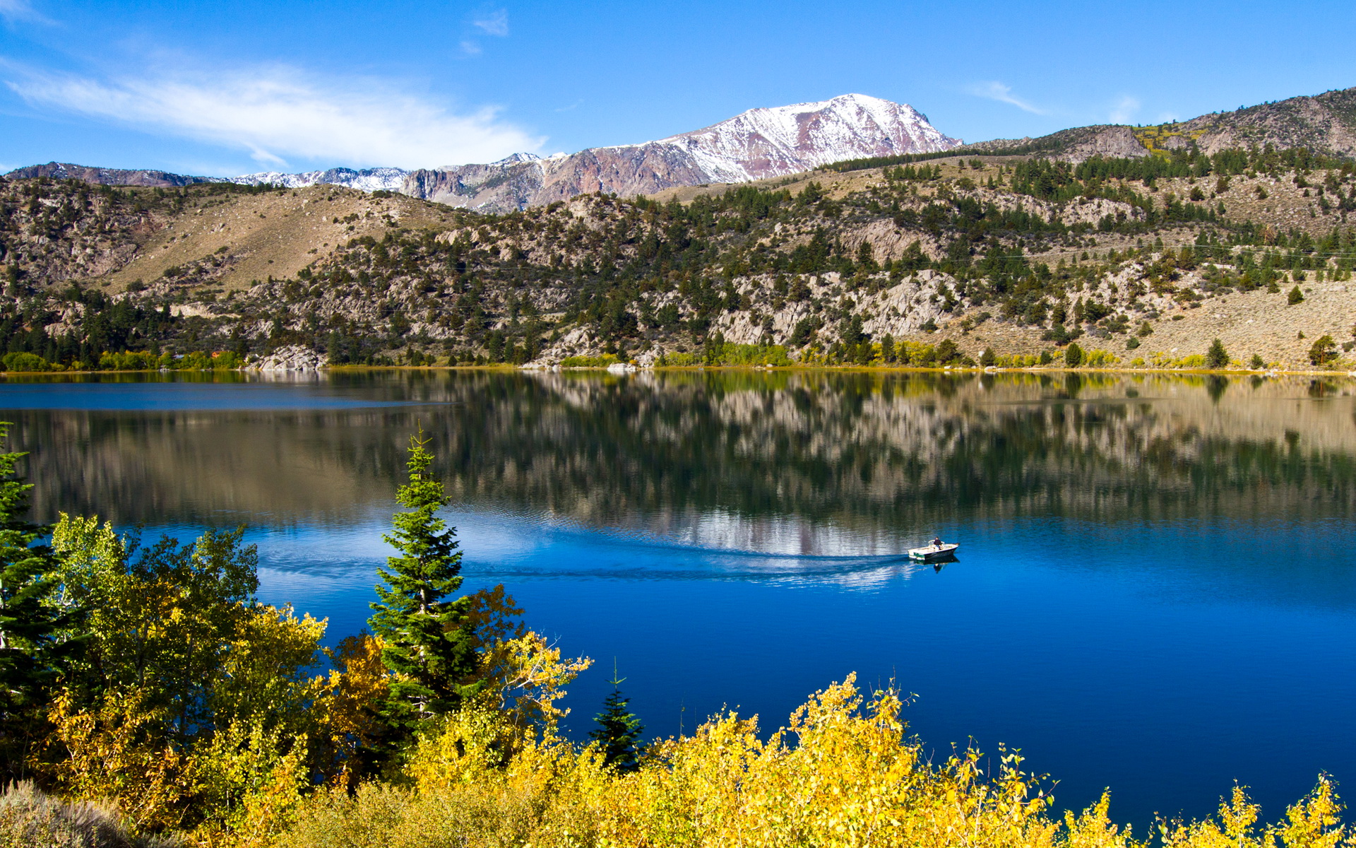 Description: A boat is on a lake surrounded by mountains and trees with a blue sky and clouds in the background.