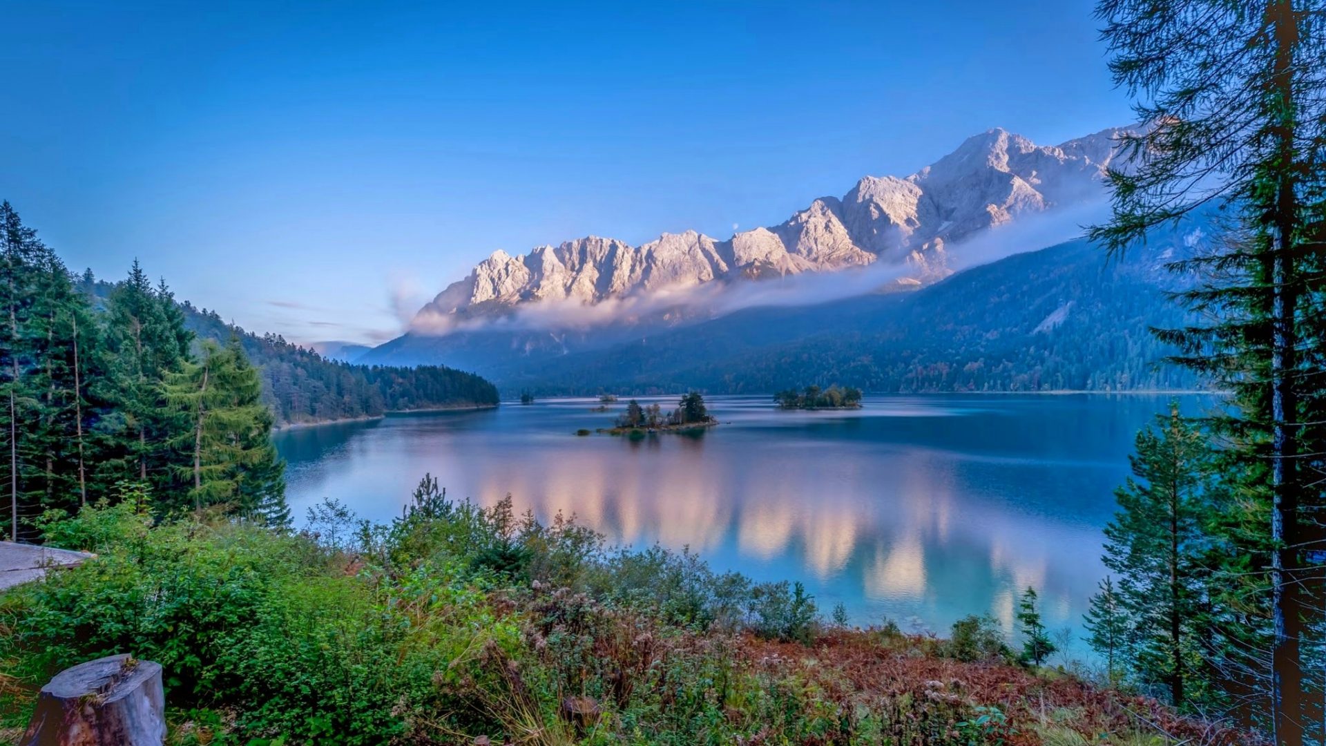 Description: A lake surrounded by mountains and trees with a bench in the foreground and a path leading to it.