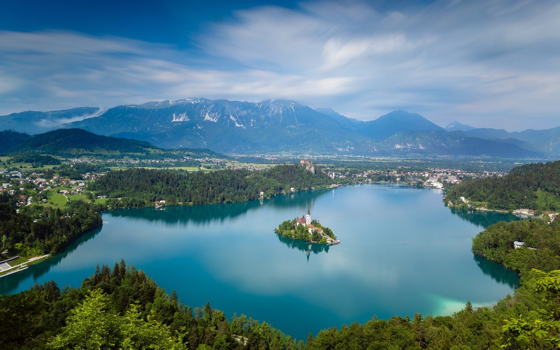 Description: A lake surrounded by mountains and trees with a church on it's island in the middle of the lake.