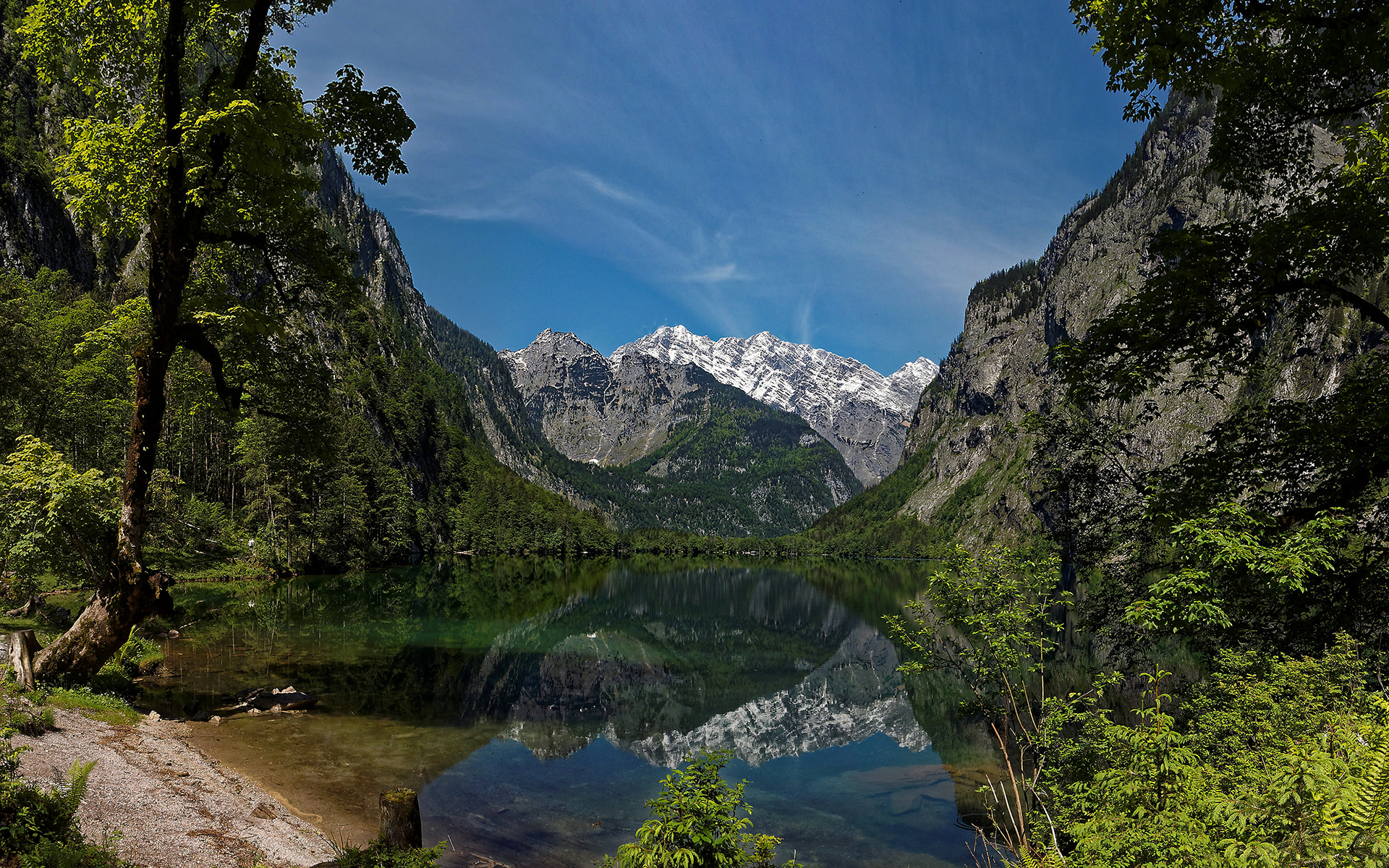 Description: A lake surrounded by mountains and trees with a clear sky above it and a few clouds in the sky.