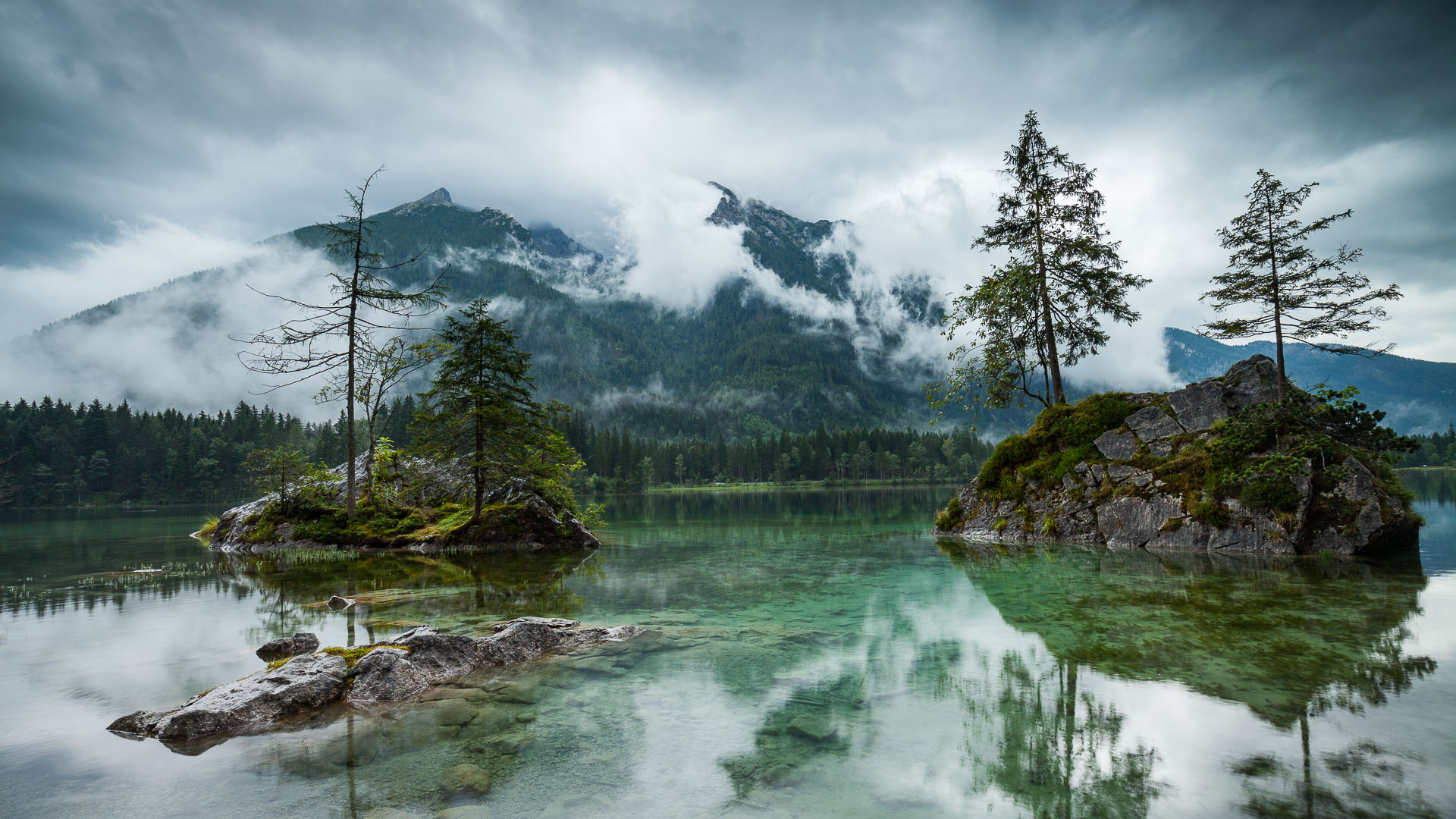 Description: A lake surrounded by mountains and trees with a cloudy sky above it and a few rocks in the water.