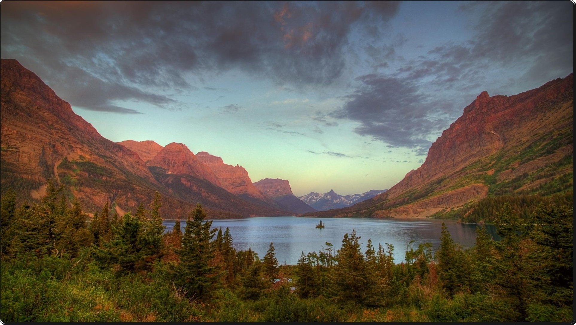Description: A lake surrounded by mountains and trees under a cloudy sky with a few clouds in the sky above it.
