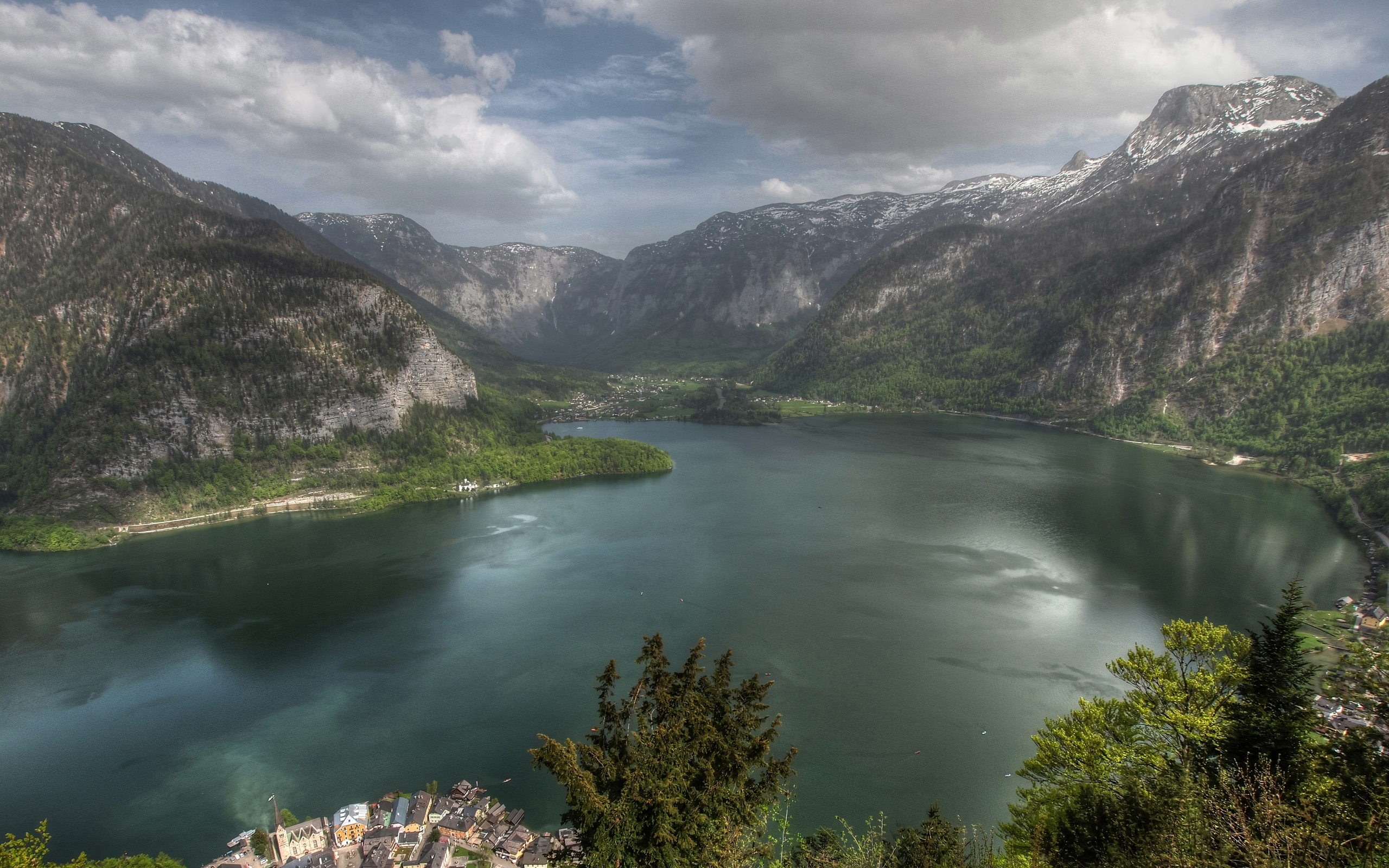 Description: A lake surrounded by mountains and trees under a cloudy sky with clouds in the sky above it is a small town.