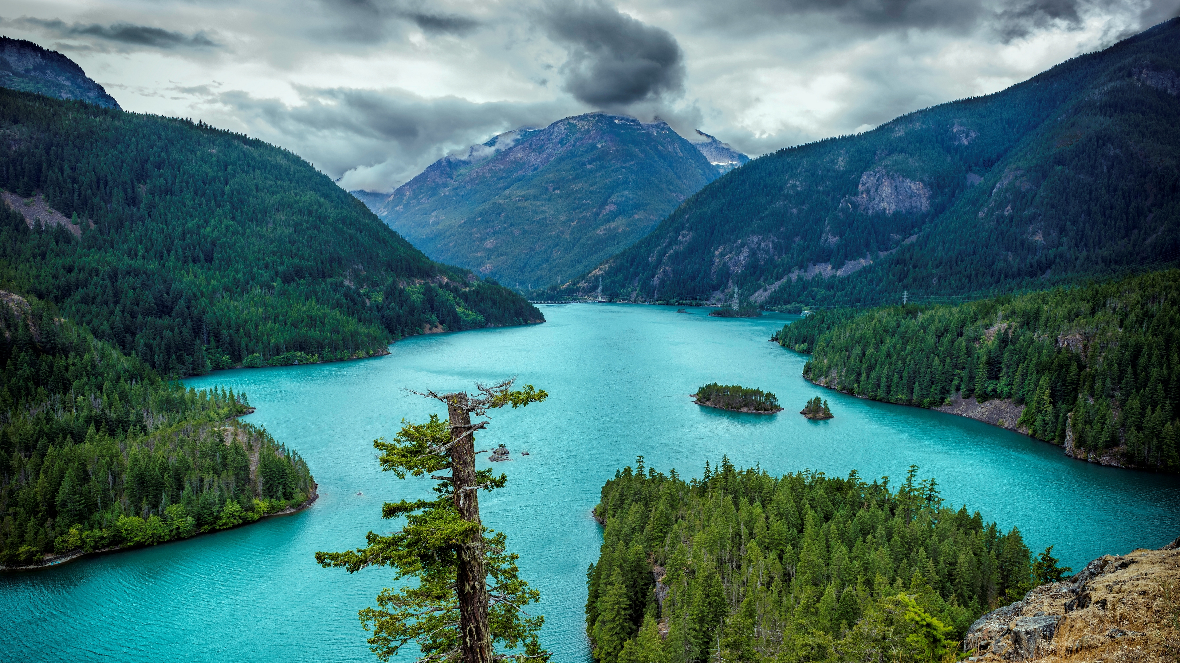 Description: A lake surrounded by mountains and trees under a cloudy sky with a few clouds in the sky above it.