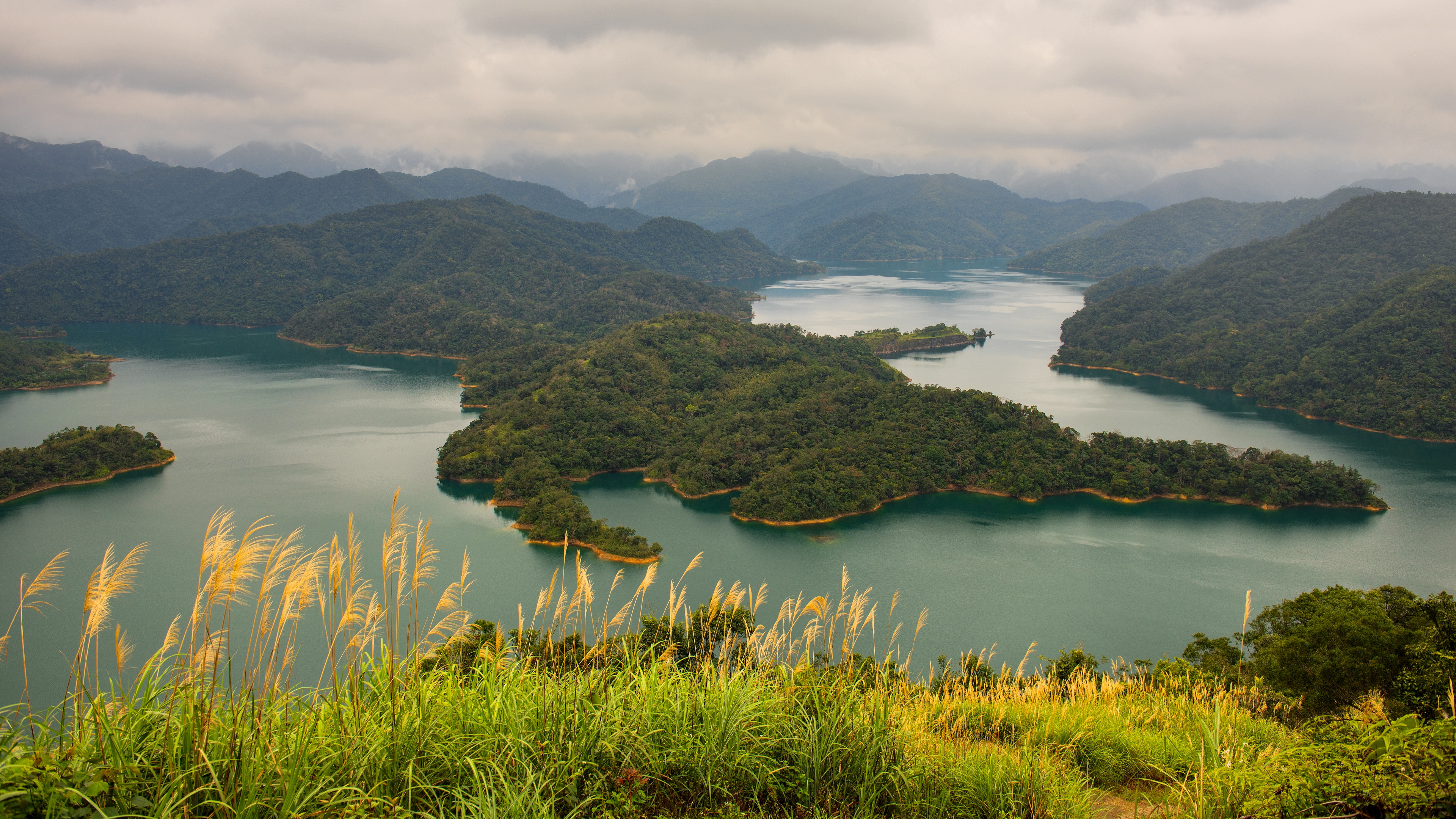 Description: A lake surrounded by mountains and trees in the middle of a forest area with a cloudy sky above it.
