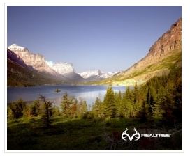Description: A lake surrounded by mountains and trees with a sky background and a white border around the picture with the words reality written below.