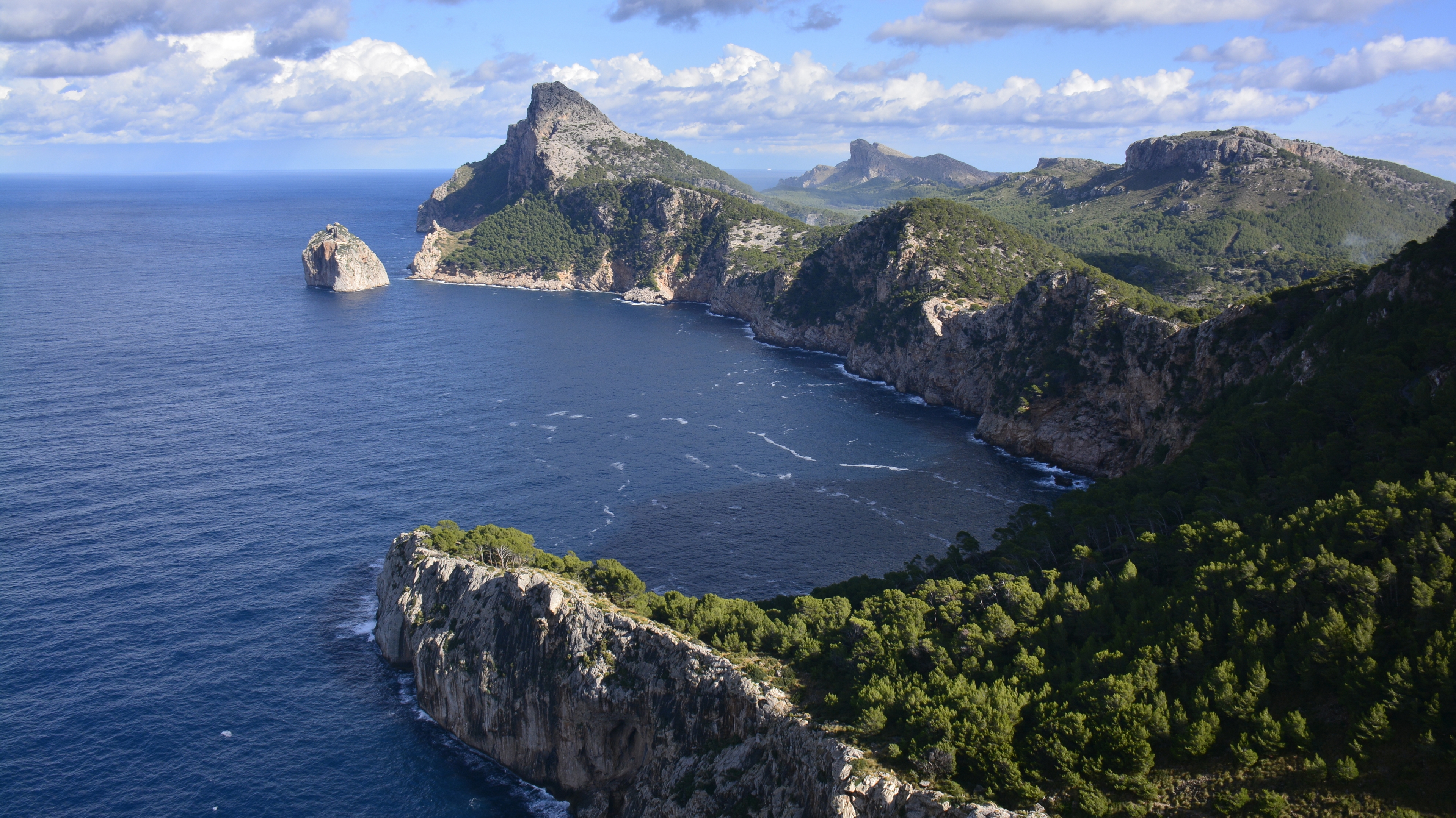 Description: A large body of water surrounded by mountains and trees on a sunny day with clouds in the sky above.