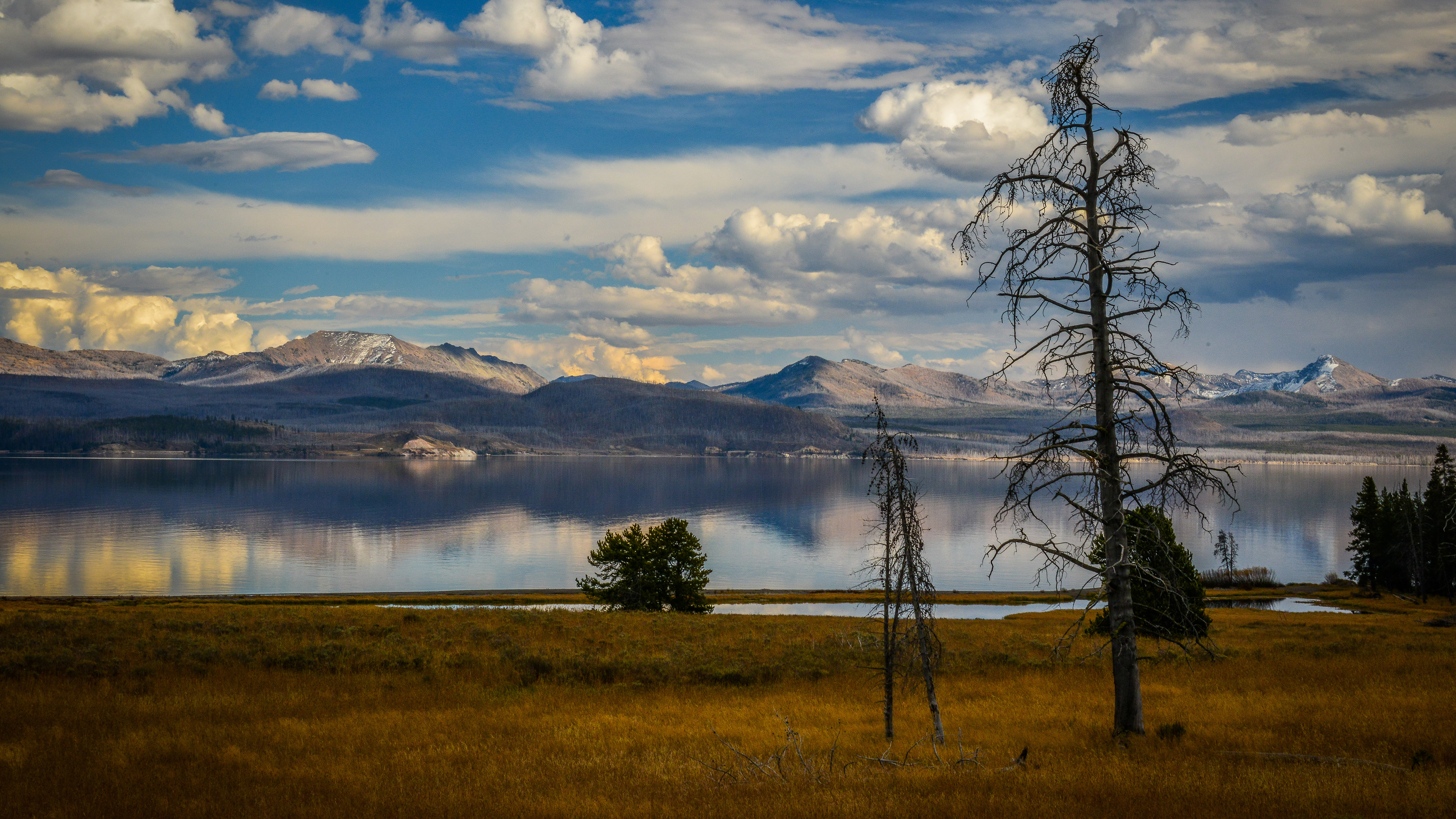 Description: A lake with a few trees in the foreground and mountains in the background with clouds in the sky.