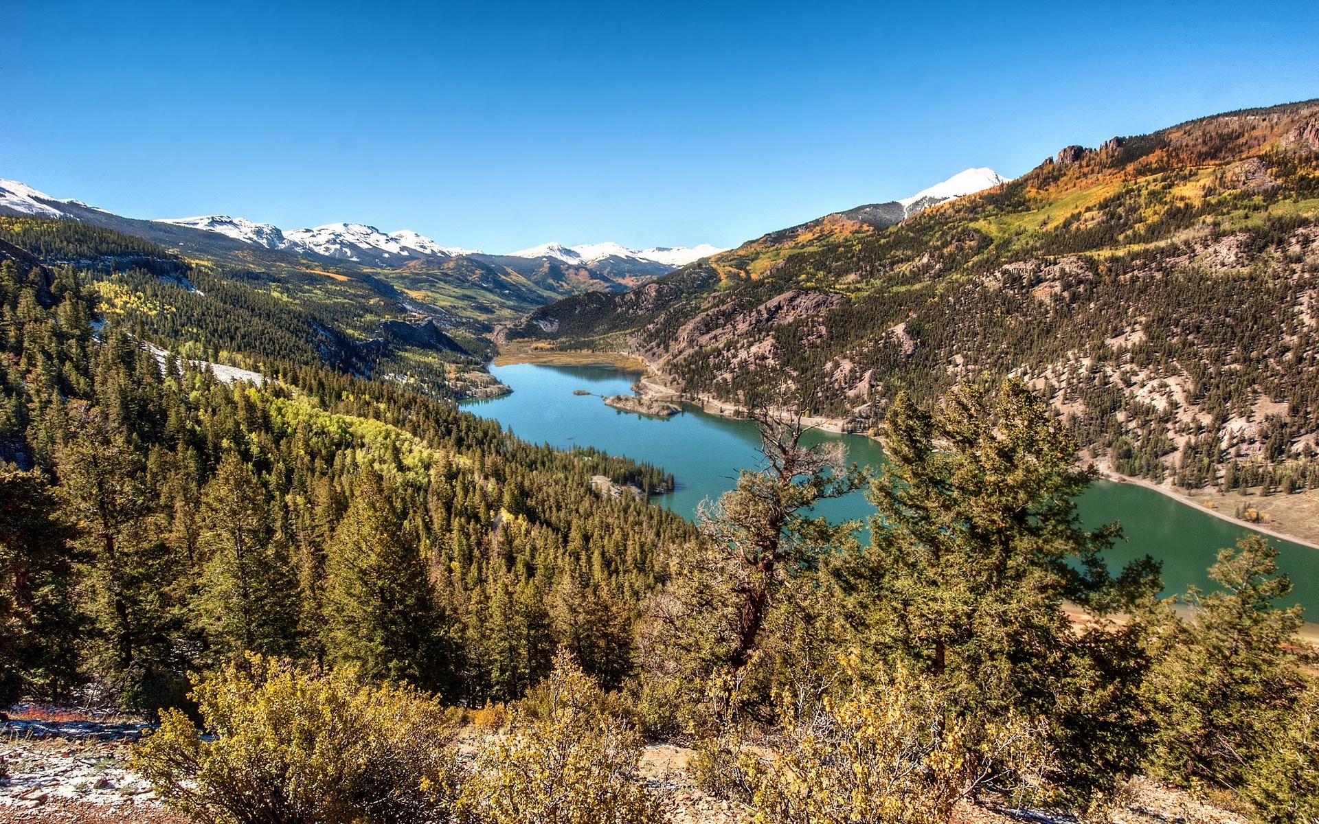 Description: A lake surrounded by mountains and trees in the middle of the day with a blue sky above it and snow capped mountains in the background.