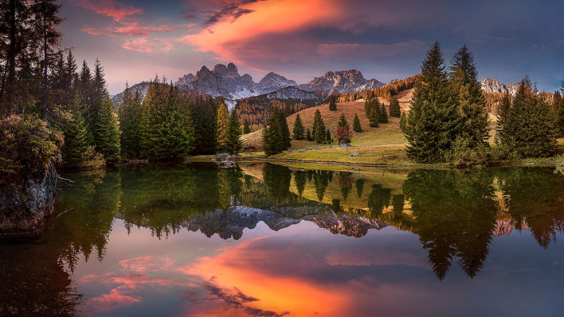 Description: A lake surrounded by trees and mountains under a cloudy sky with a sunset in the background and a pink sky.