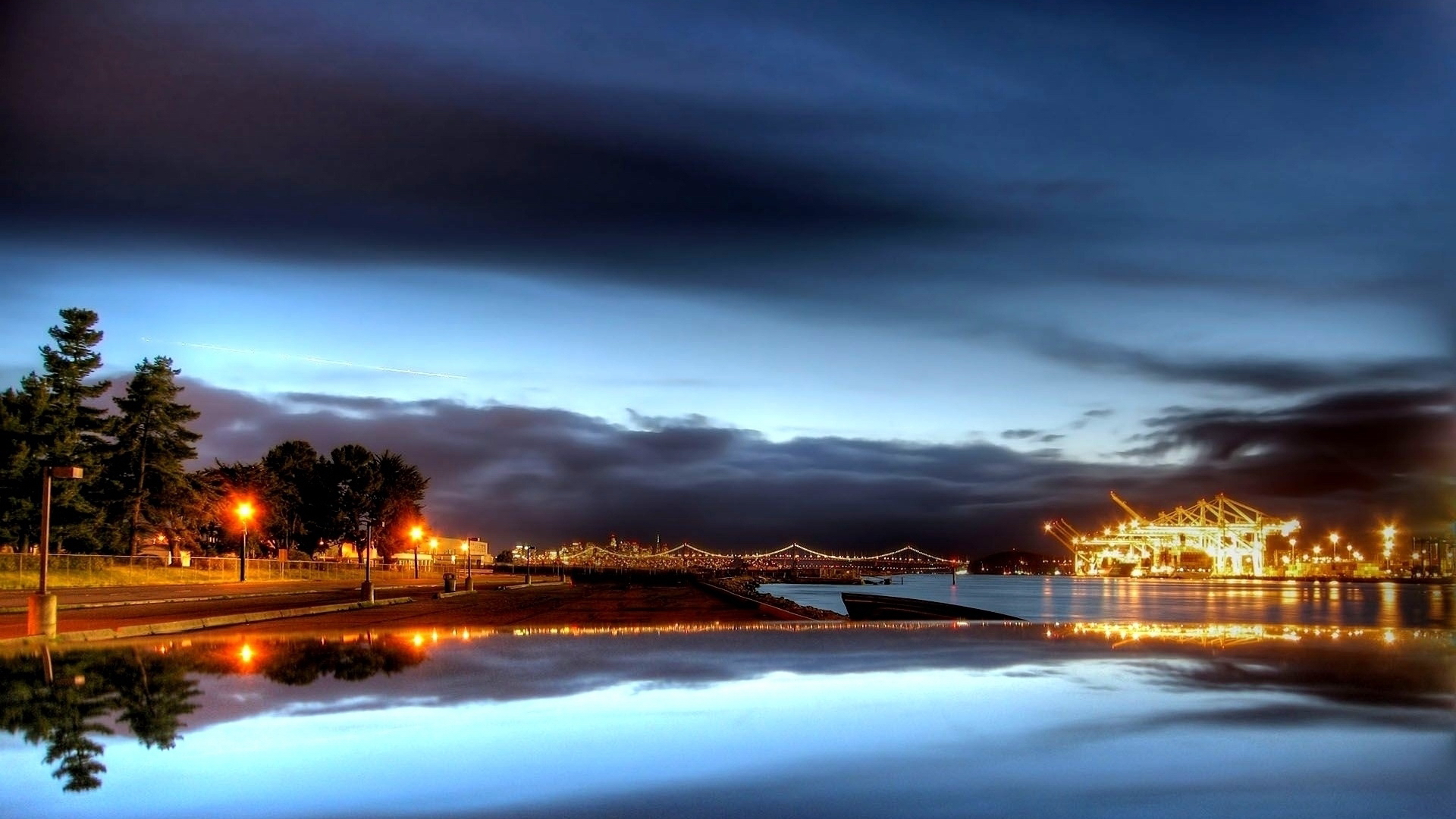 Description: A lake with a pier and a building in the background at night time with lights on the water and a cloudy sky.