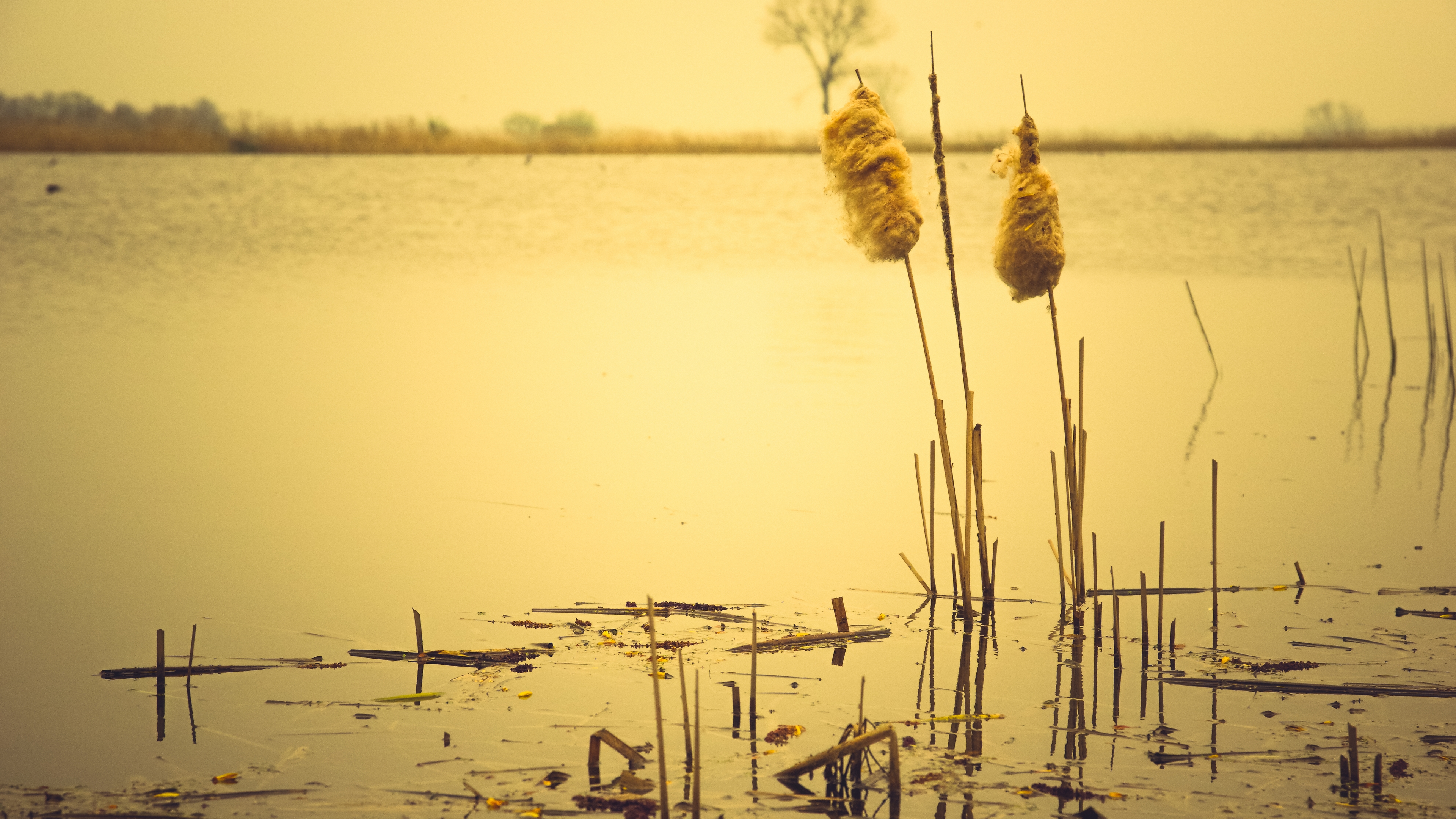 Description: A lake with some plants in it and water in the background with a few weeds growing out of the water.