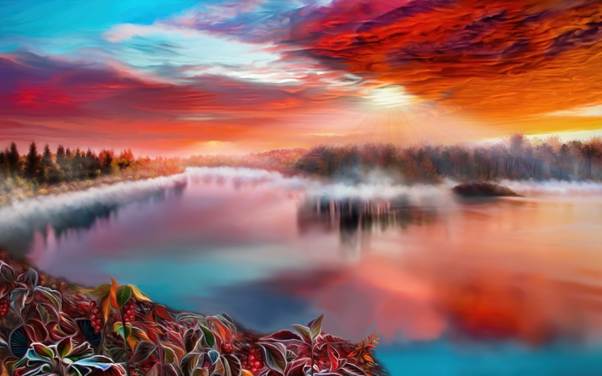 Description: A painting of a lake with a colorful sky in the background and trees in the foreground and a red and blue sky in the background.