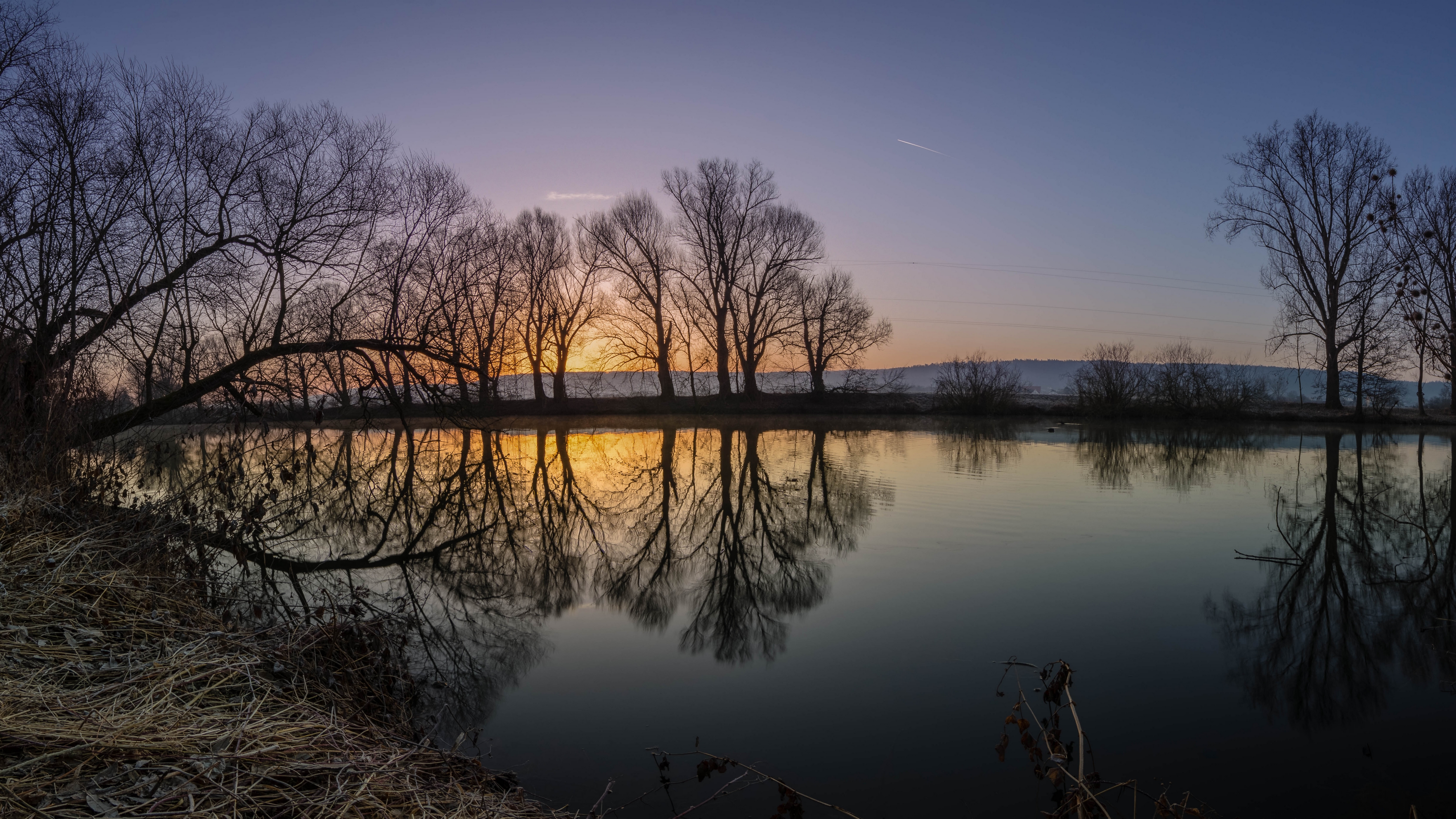 Description: A lake with trees and a sunset in the background with a few clouds in the sky and a few trees in the foreground.