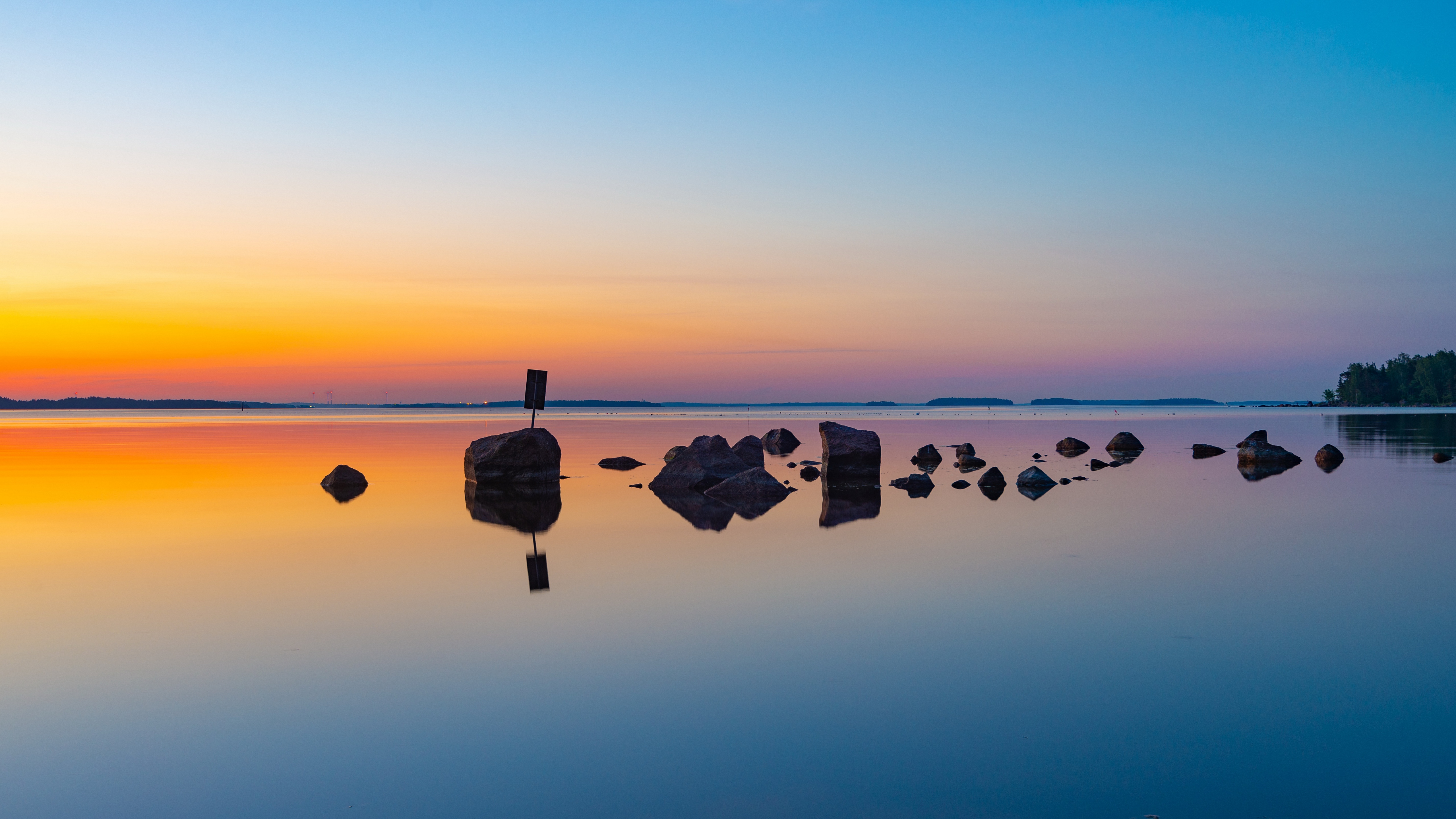 Description: A lake with rocks and a flag on it at sunset or dawn with a blue sky and a few clouds.
