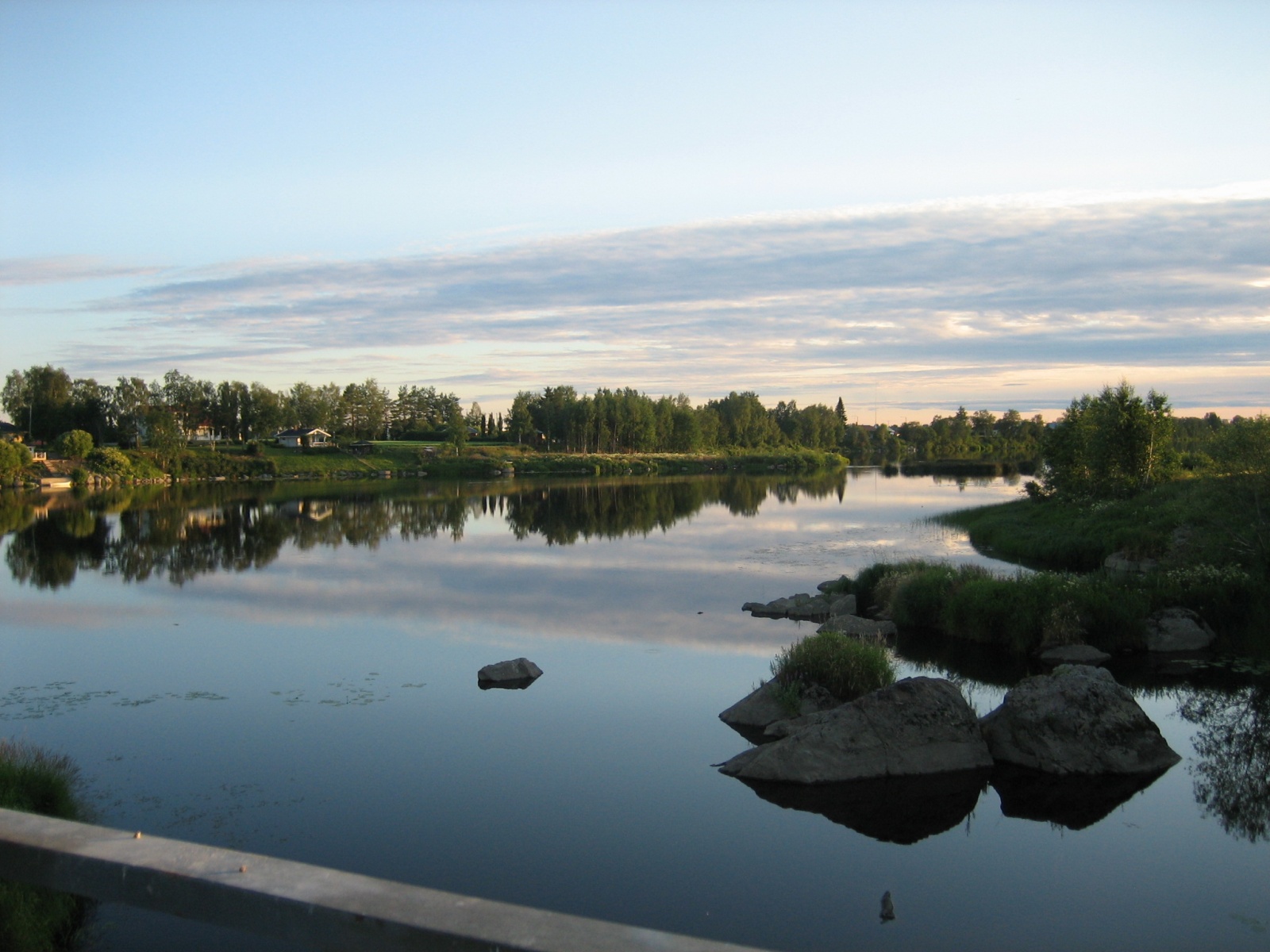Description: A lake with rocks in the water and a sky background with clouds in the distance and a few trees.