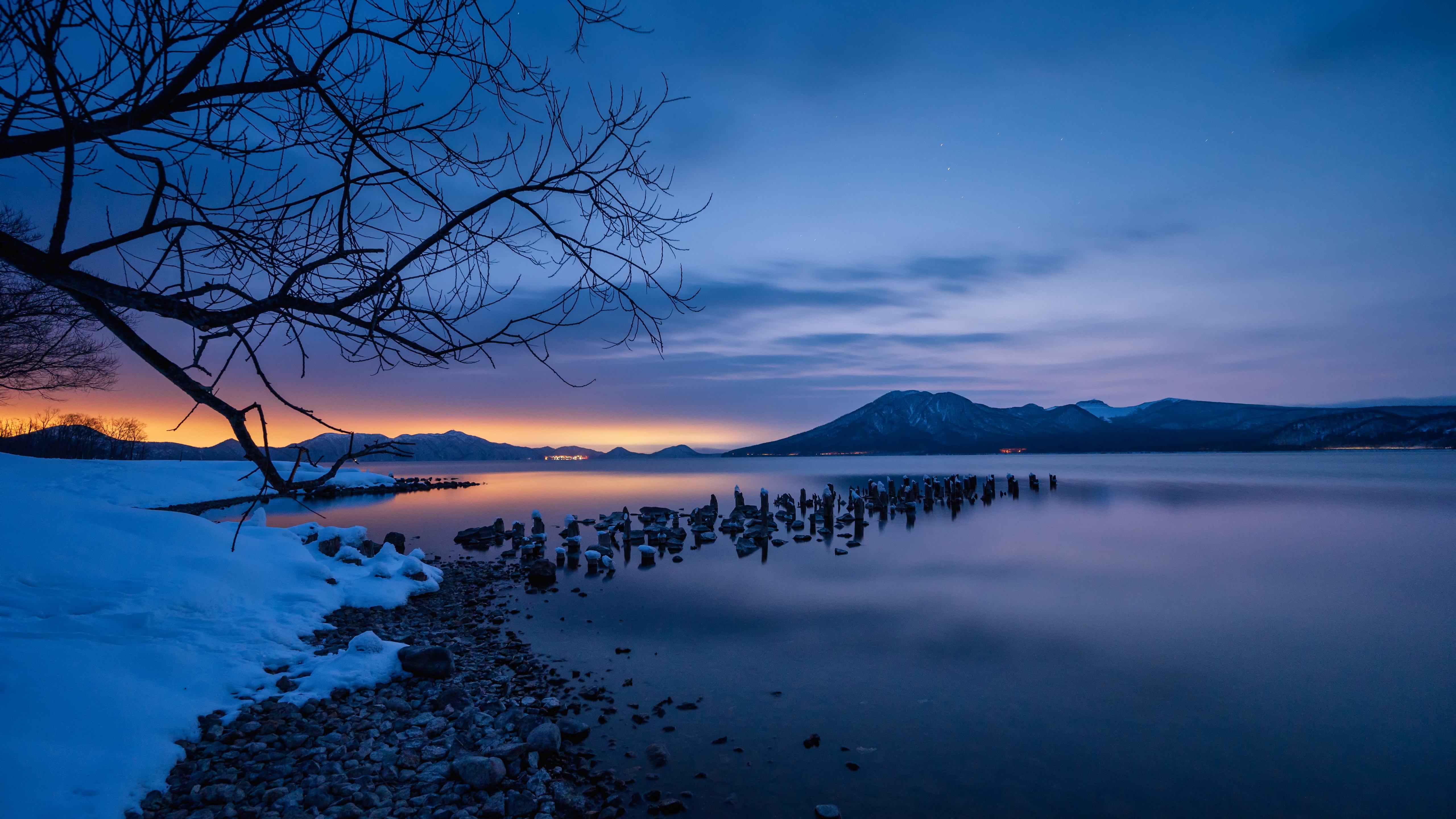 Description: A lake with a bunch of rocks in it and a tree in the foreground with a mountain in the background.