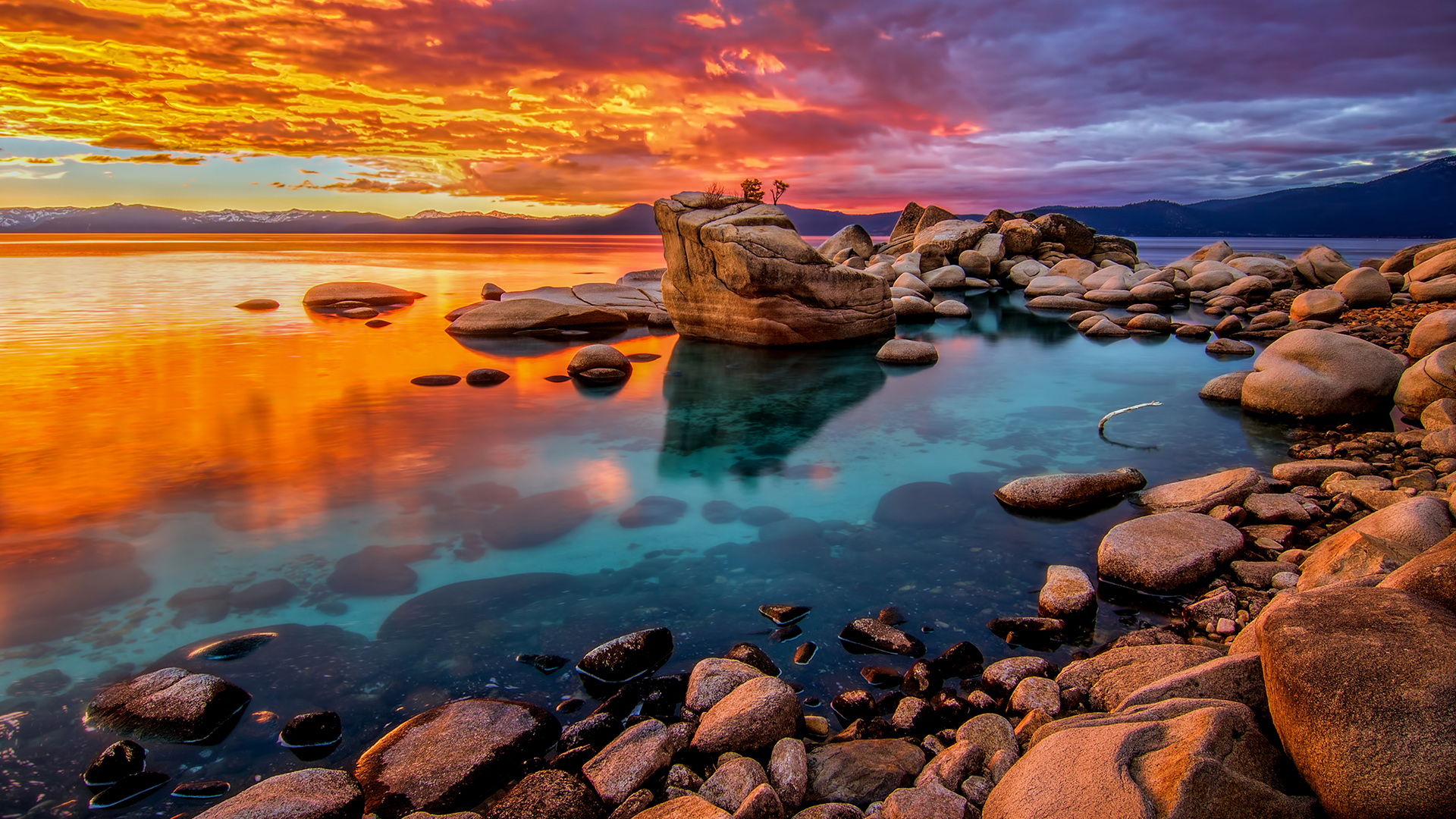 Description: A lake with rocks and water under a colorful sky with clouds above it and a person standing on a rock.