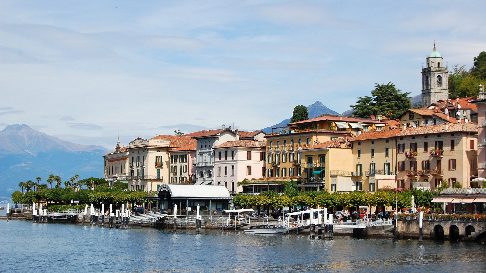 Description: A row of houses on the shore of a lake with mountains in the background and a clock tower in the distance.