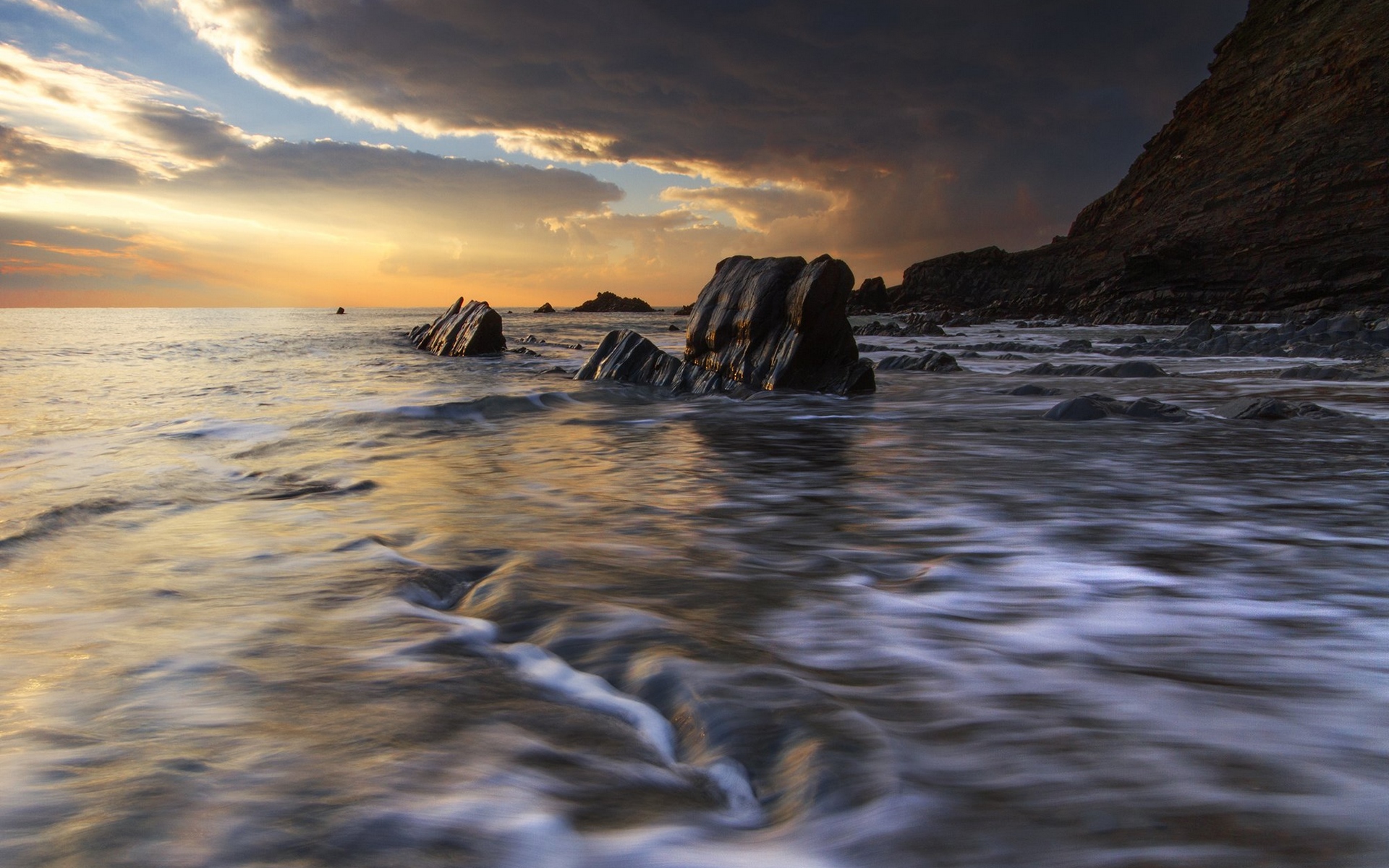 Description: A body of water with rocks in the background and a sky with clouds above it and a person in a boat in the distance.