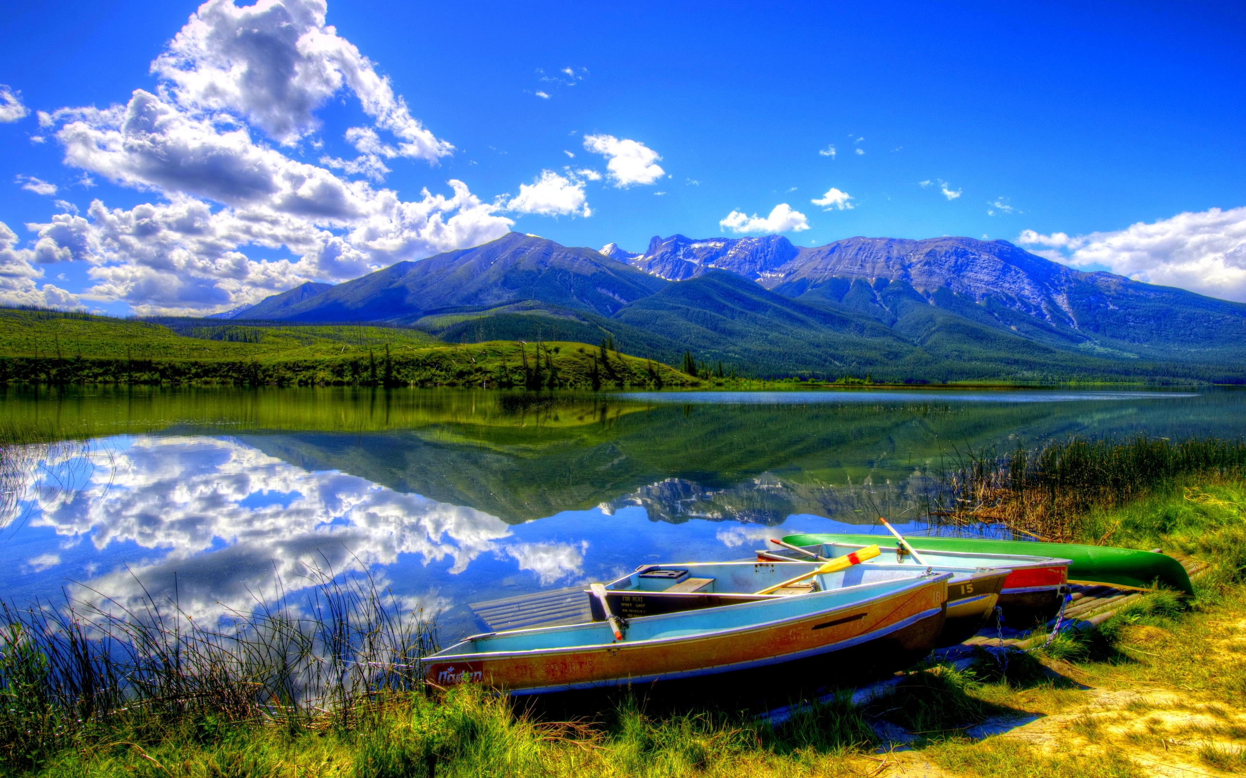 Description: A boat is sitting on the shore of a lake with mountains in the background and clouds in the sky.