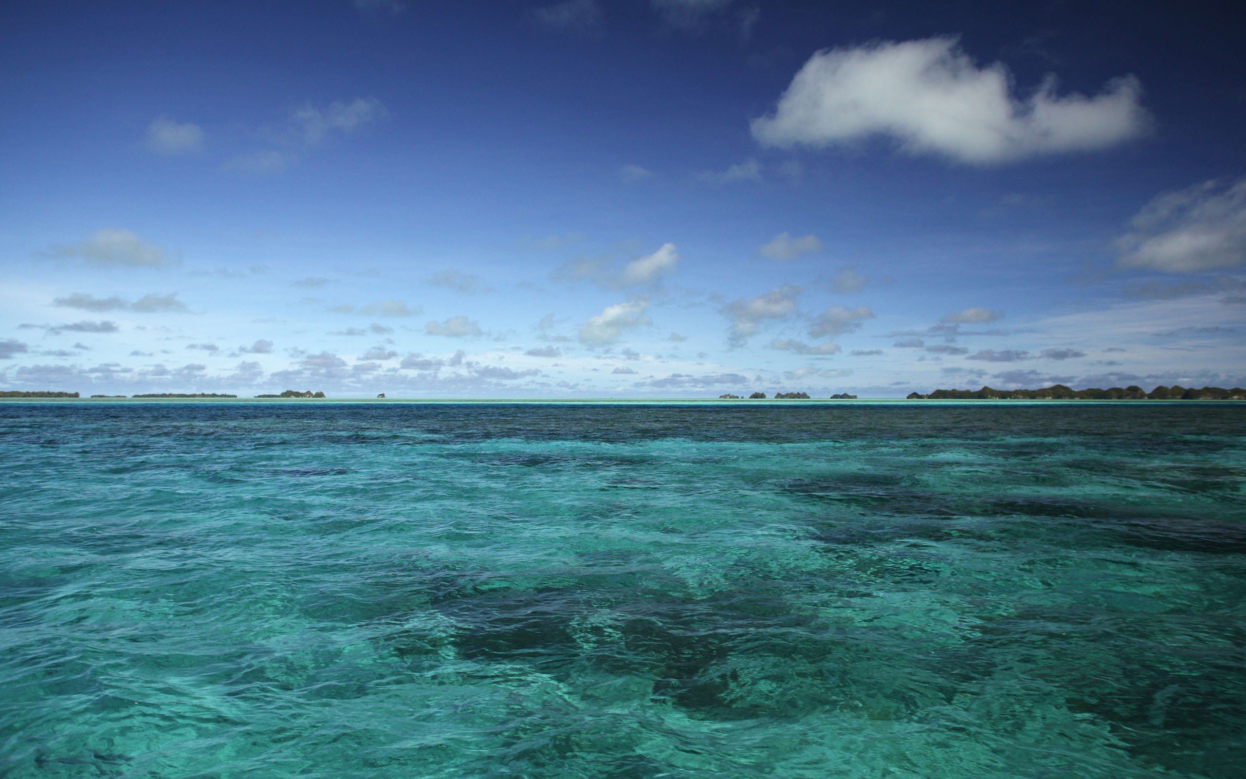 Description: A body of water with a sky background and clouds above it and a small island in the distance with a few trees.