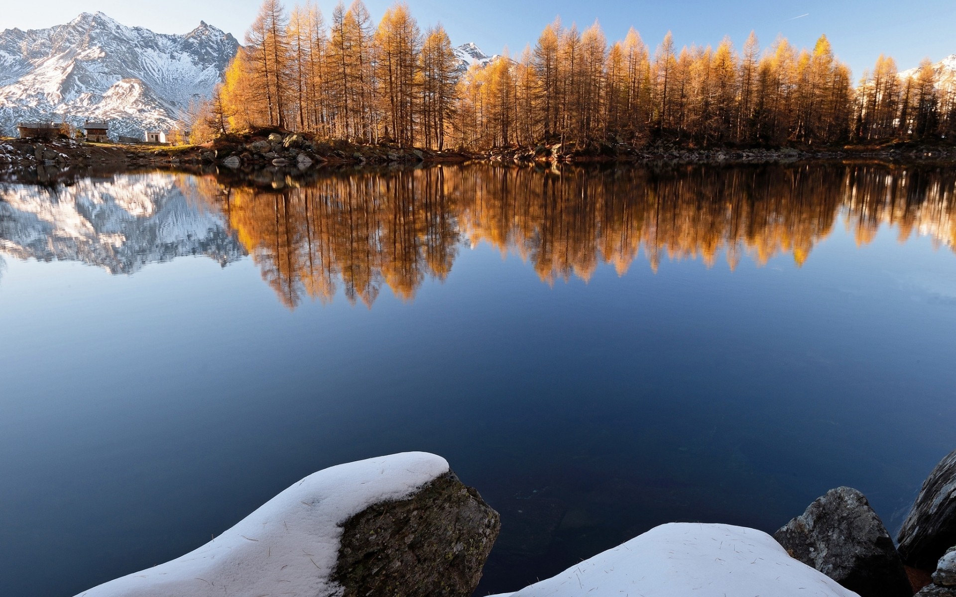 Description: A lake surrounded by snow covered rocks and trees in the background with a mountain range in the distance with a blue sky.