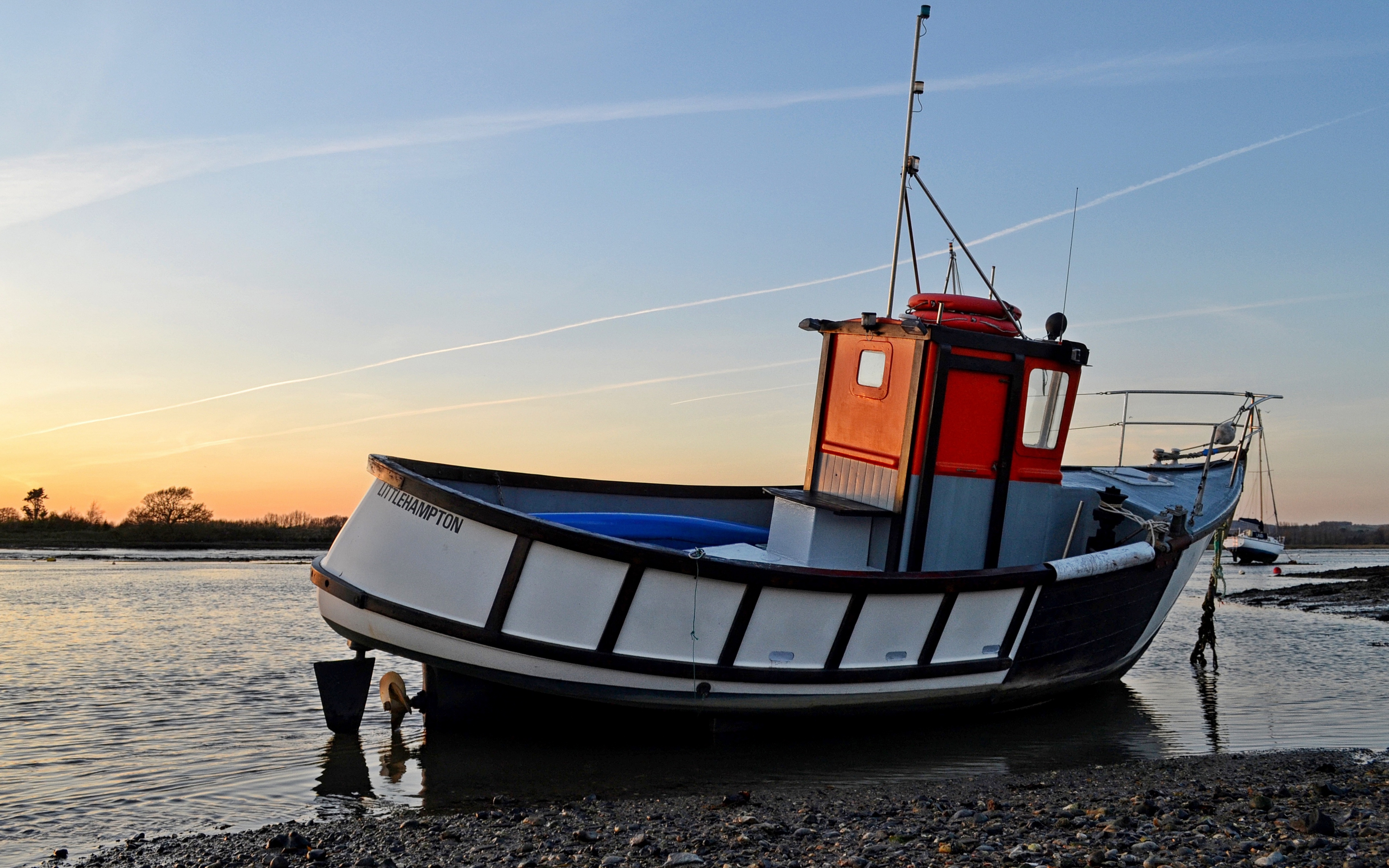 Description: A boat sitting on the shore of a lake at sunset or dawn with a few clouds in the sky.