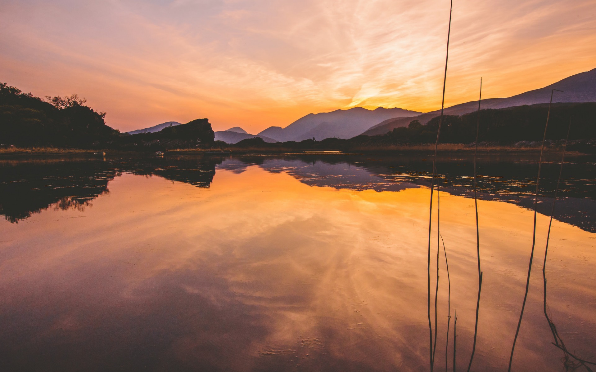 Description: A lake with a sunset in the background and mountains in the distance with a few clouds in the sky.