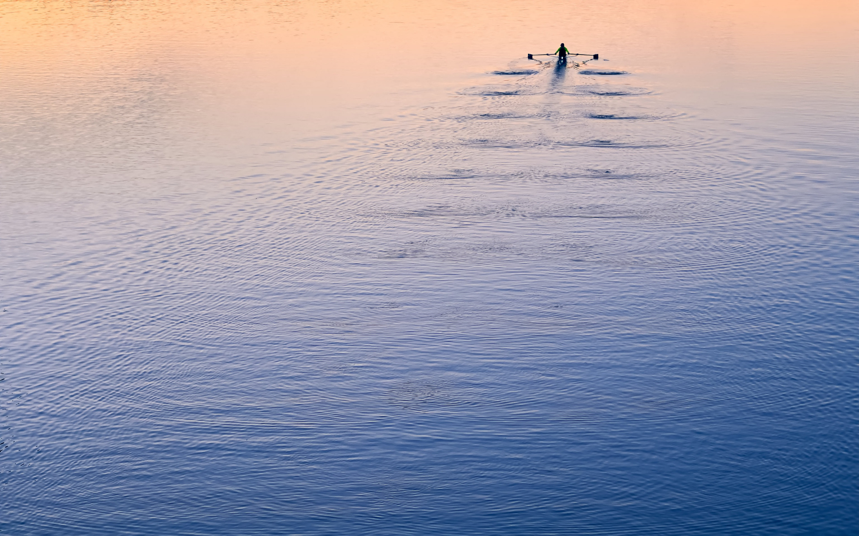 Description: A person rowing a boat on a lake at sunset or dawn with a few boats in the water and a person on the boat.