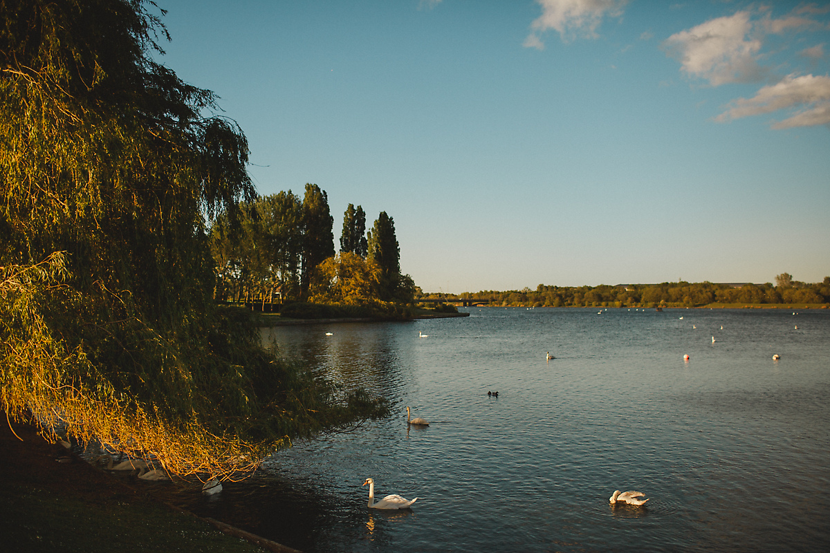 Description: A lake with swans and ducks swimming in it and trees around it and a blue sky with clouds above.