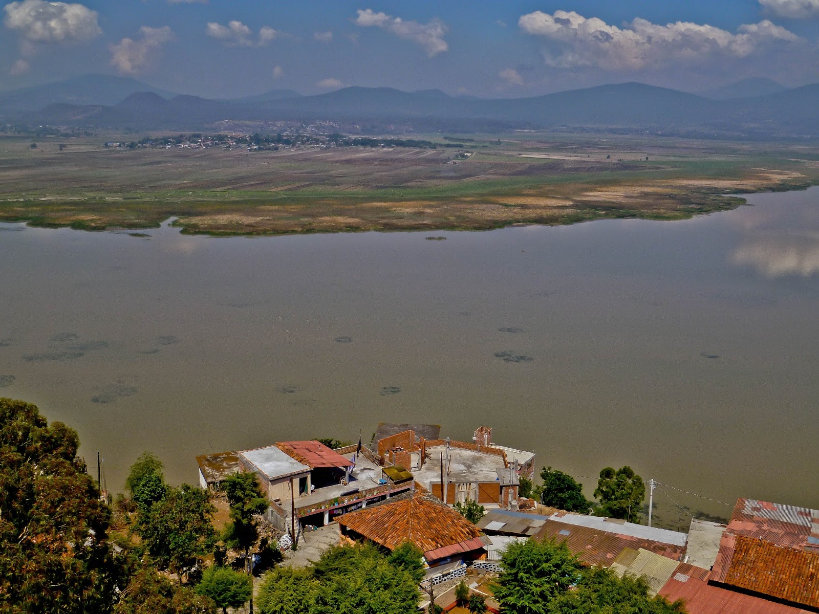Description: A view of a lake and a town with mountains in the background and a few clouds in the sky.