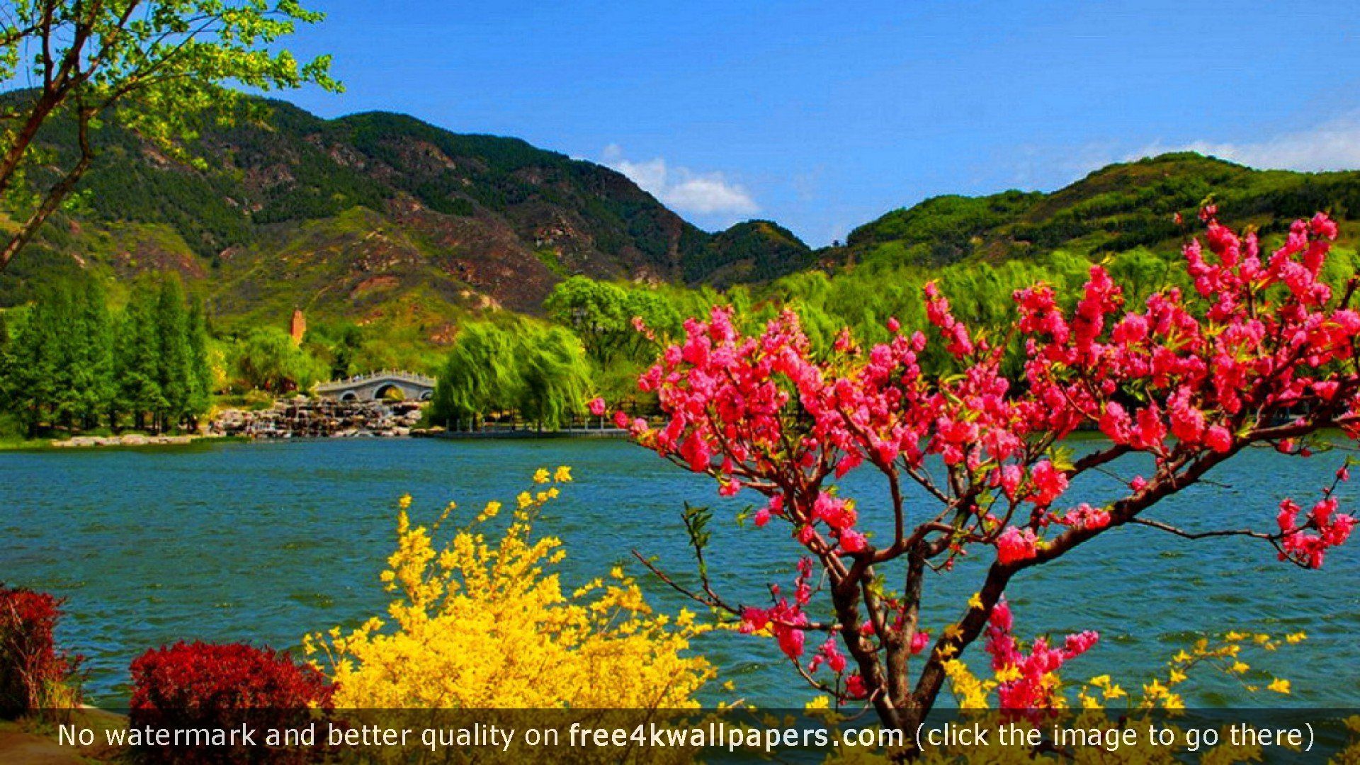 Description: A lake with a tree and flowers in the foreground and a mountain in the background with a quote written below.
