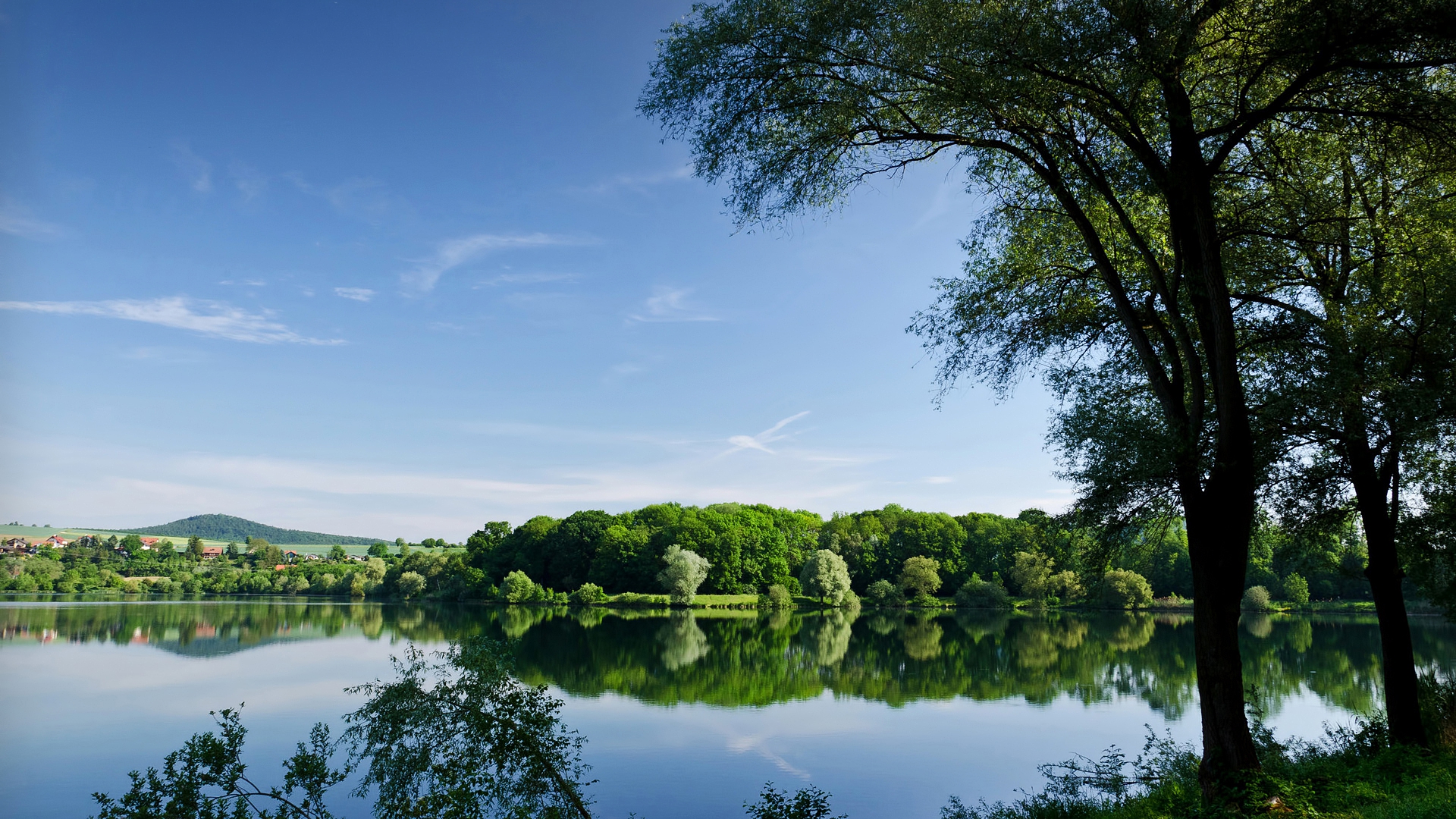 Description: A lake surrounded by trees and a blue sky with clouds in the background and a few clouds in the sky.