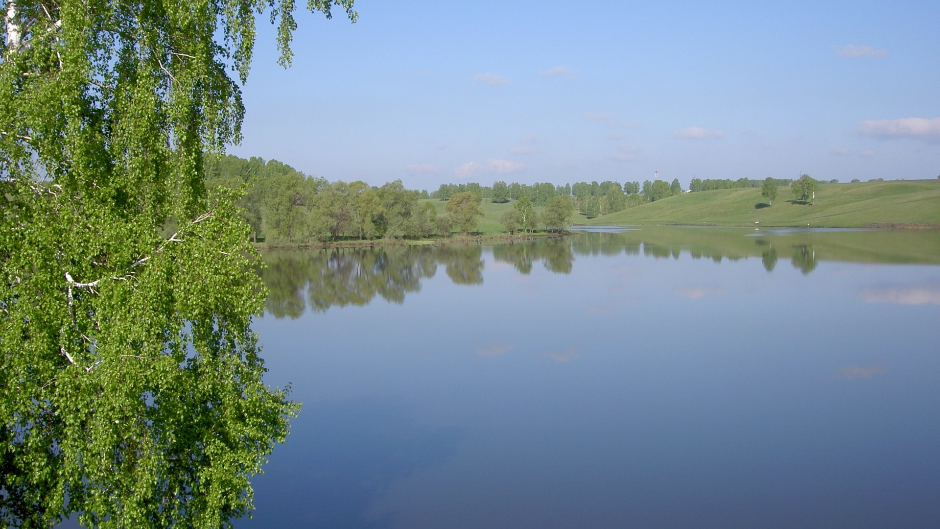 Description: A lake with a few trees in the background and a blue sky with clouds in the background and a few clouds in the sky.