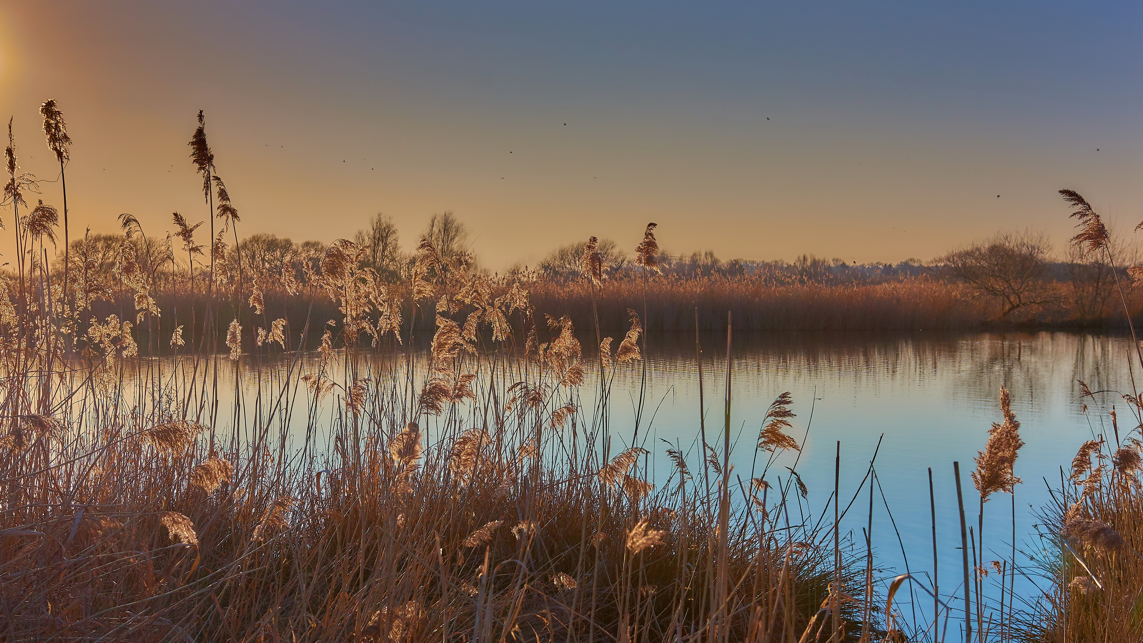 Description: A lake surrounded by tall grass and a forest in the background at sunset or dawn with a few birds flying in the sky.