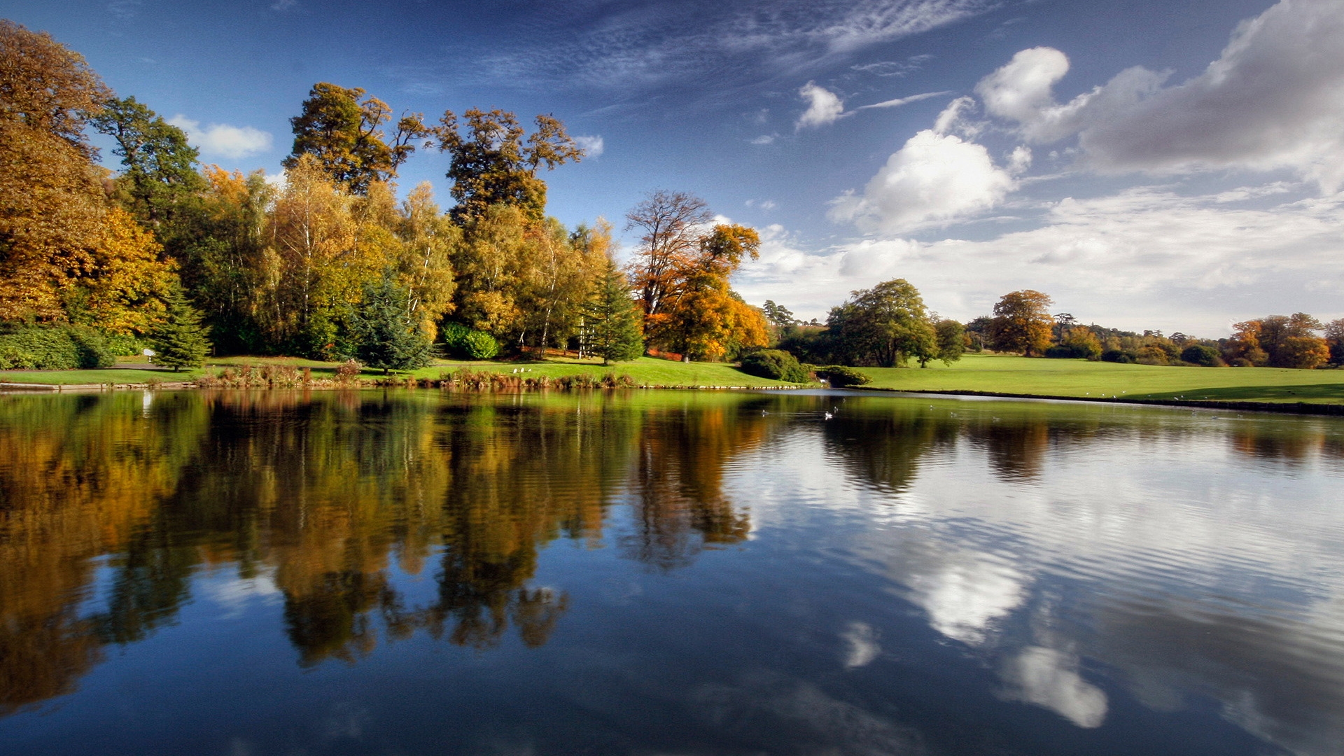 Description: A lake surrounded by trees with clouds in the sky above it and a golf course in the background with a few ducks.